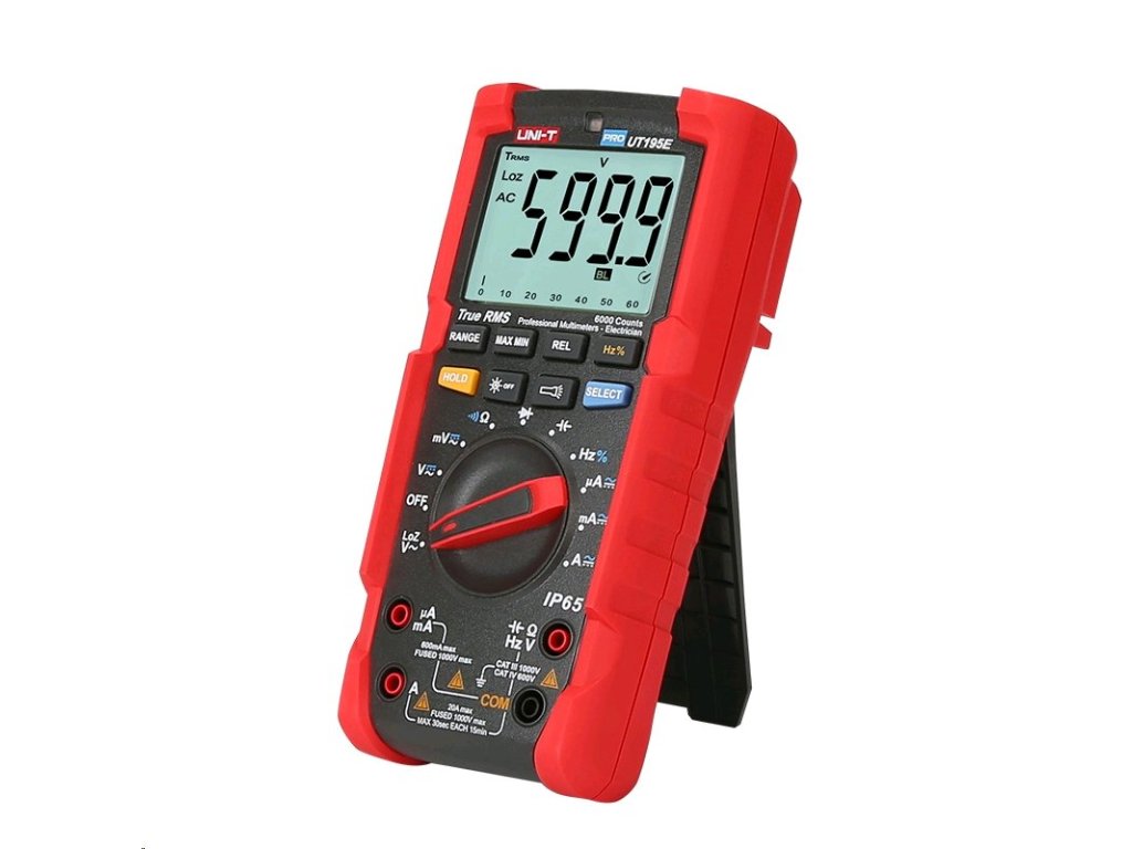Multimeter UT195E je vysoko odolný prístroj určený pre elektrikárov, opravárov, údržbárov a servisných technikov. Je vhodný na každodenné používanie aj v tých najnáročnejších podmienkach. Prístroj vydrží pád z výšky 2 m a vďaka stupňu krytia IP65 poskytuje vynikajúcu ochranu proti vode a prachu. Vďaka TrueRMS môžete presne merať aj nesymetrické striedavé napätie a prúd. Digitálny displej má veľké, ľahko čitateľné číslice a je doplnený funkciou automatického podsvietenia. Multimeter UNI-T UT195E je certifikovaný podľa najnovších noriem a vyhovuje kategóriám prepätia CAT IV 600 V a CAT III 1000 V.