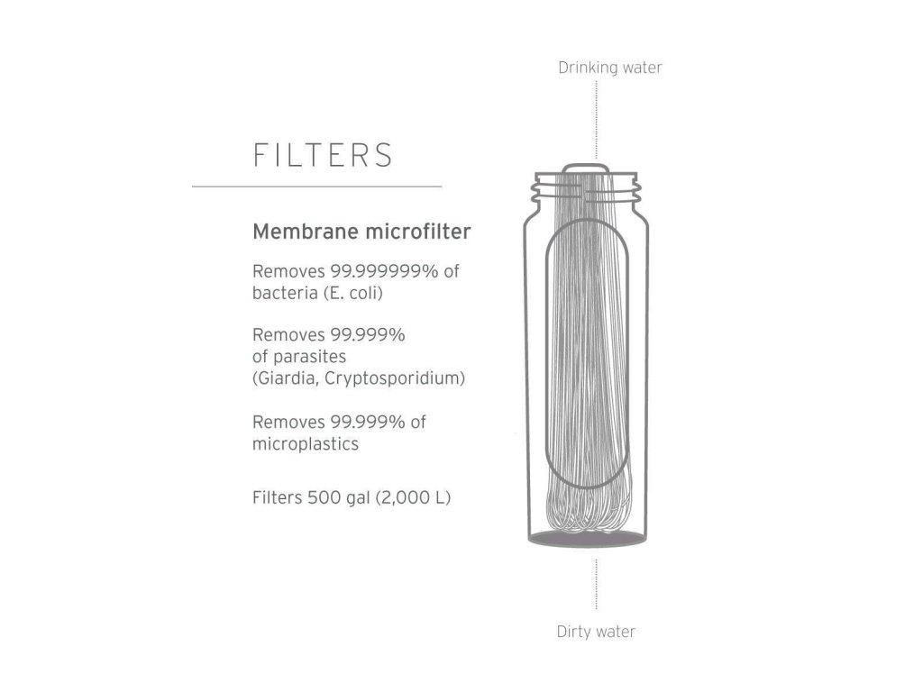 Všestranný dizajn pre trailový beh, turistiku a dobrodružstvá. Chráni pred 99,999999% baktériami, parazitmi, mikroplastmi, bahnom, pieskom a zákalom.