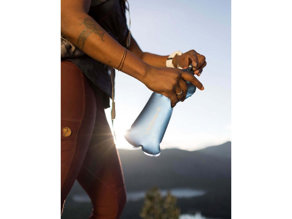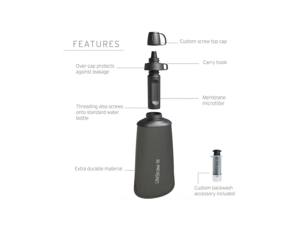 Je čas prestať so sebou nosiť vrece plastových dielov a viacero fliaš s vodou. Kompaktná stláčacia fľaša s filtrom LifeStraw Peak je zariadenie na uchovávanie a filtráciu vody v jednom. Je vyrobená z prémiových materiálov, aby bola dostatočne odolná, a vydržala pri cestách a dobrodružstvách na dlhé vzdialenosti bez toho, aby ste sa museli obávať roztrhnutia alebo prepichnutia. Ultraľahký a skladateľný dizajn s nízkou hmotnosťou umožňuje viacero spôsobov použitia v kombinácii s ďalším systémom LifeStraw Peak. Hustota filtračnej membrány bola navrhnutá pre optimálny prietok a náustok s kvalitným tesnením zabraňuje úniku vody. Vrchnák je vybavený okom na zavesenie.