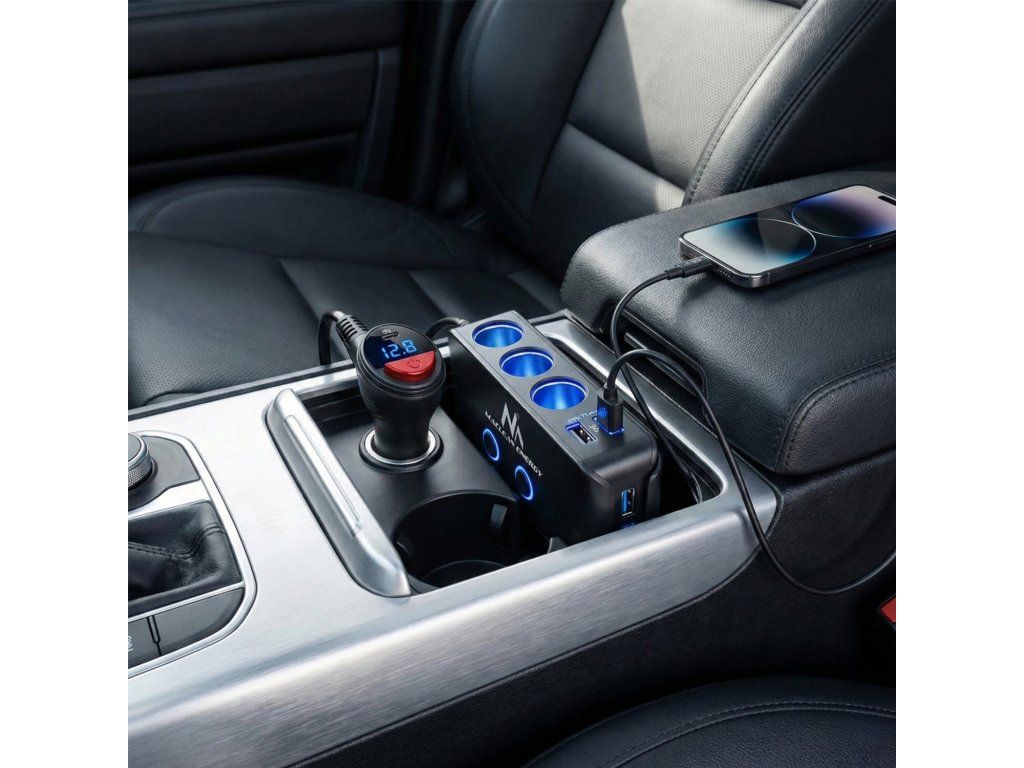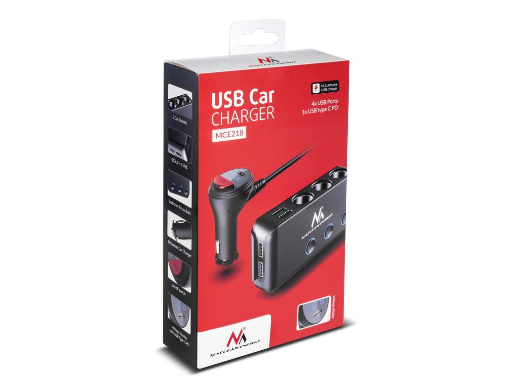 Čierny rozdeľovač zásuviek zapaľovača, voltmeter, 3 zásuvky zapaľovača, 1xQuick Charge 3.0, 3xUSB 6,8A, 1x Power Delivery 18W USB-C, Maclean MCE218, Max 120W