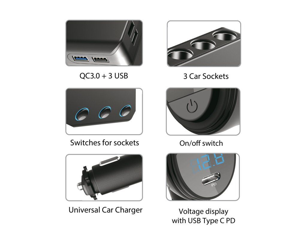 Rozdeľovač zásuviek zapaľovača do auta od 1 do 3 + štyri zásuvky USB (1xQC) + voltmeter + USB-C Power Delivery.