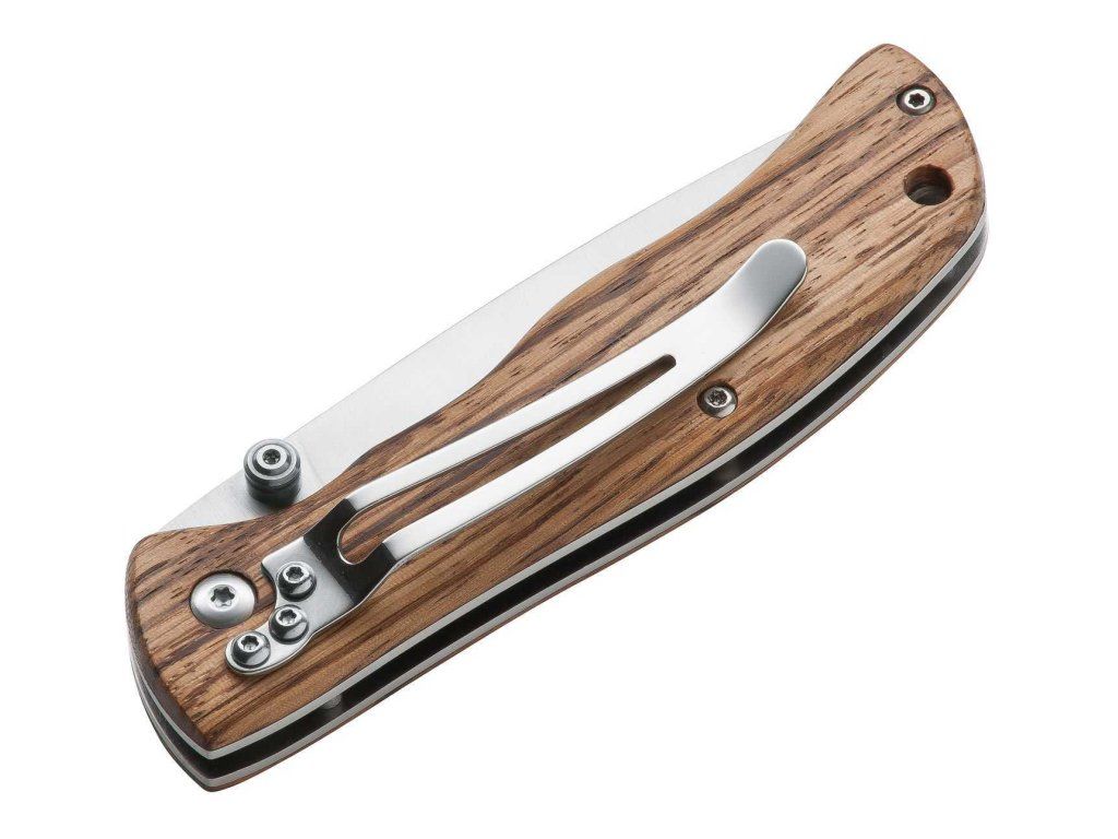 Rukoväť je obložená drevom, vďaka ergonomickému tvaru sa dobre drží. So sponou na vrecká.
