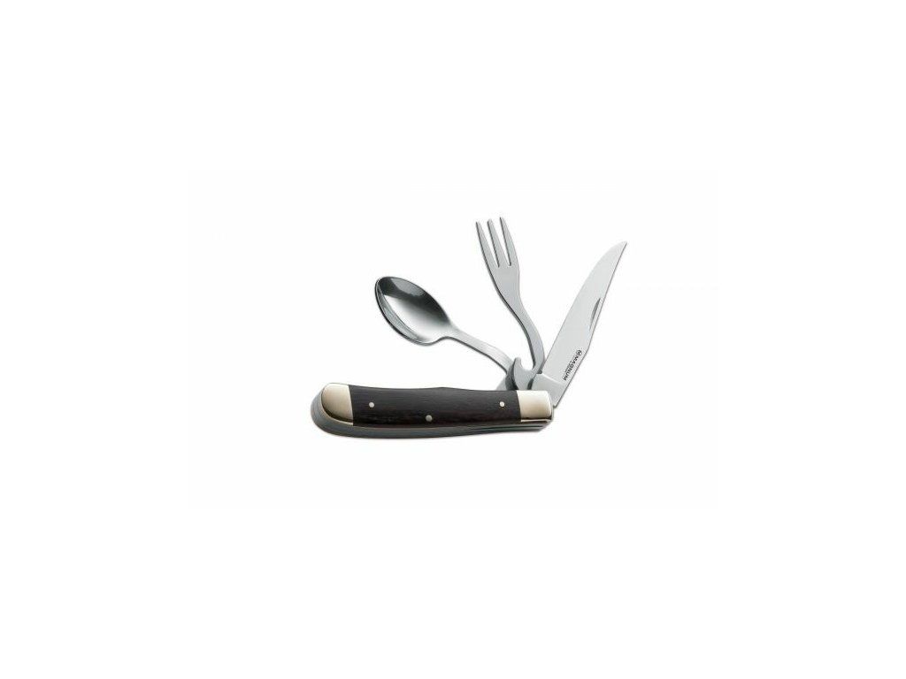 Nôž s hladkou hranou, vidlička a lyžica sú vyrobené z nehrdzavejúcej ocele 440A, otvára sa manuálne nechtom Nail Nick a zaisťuje ju pružina pripevnená na konci chrbtice - Slipjoint.