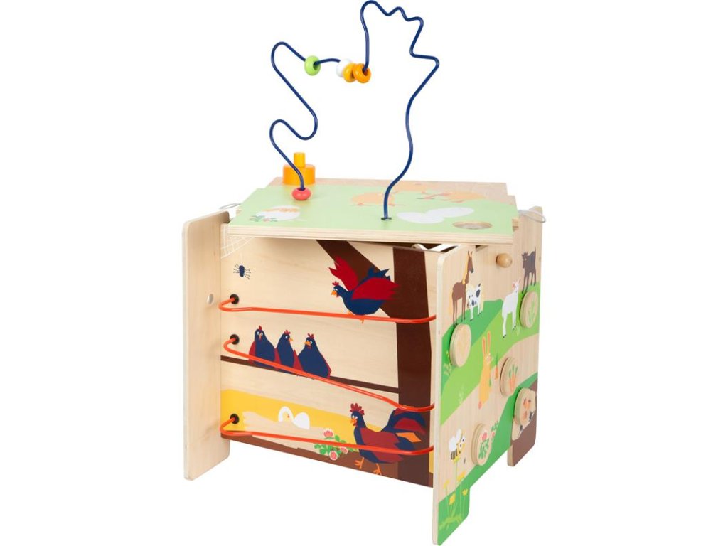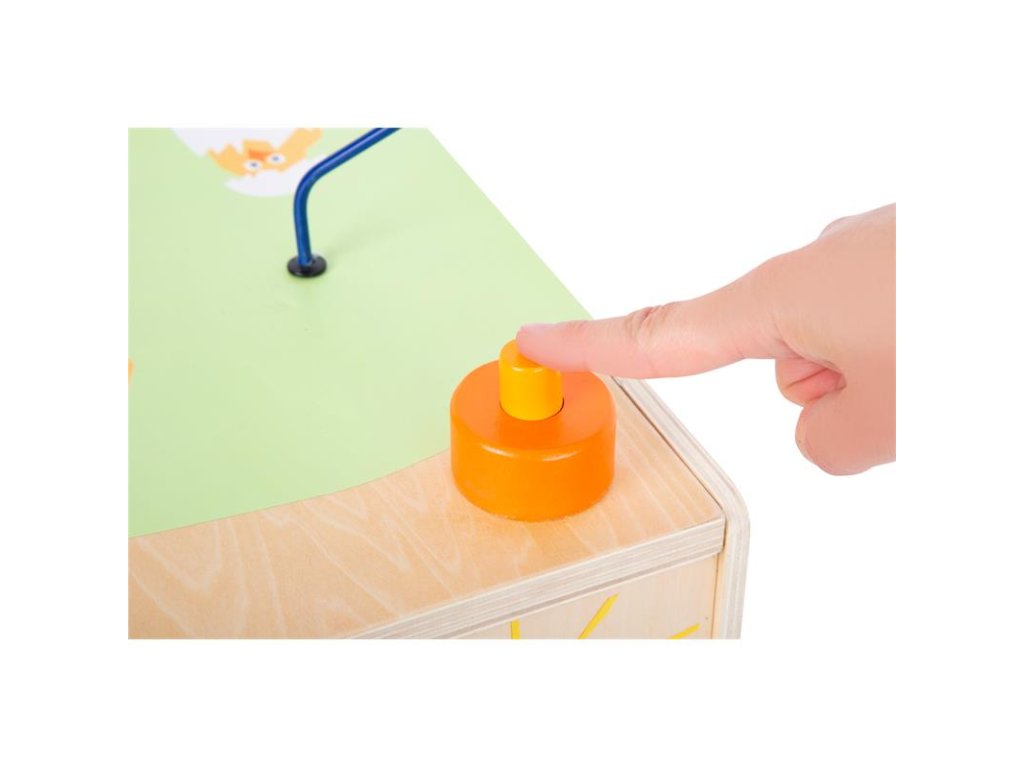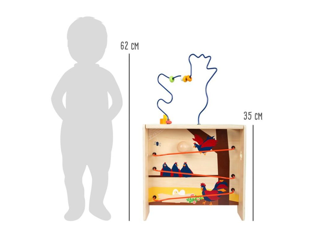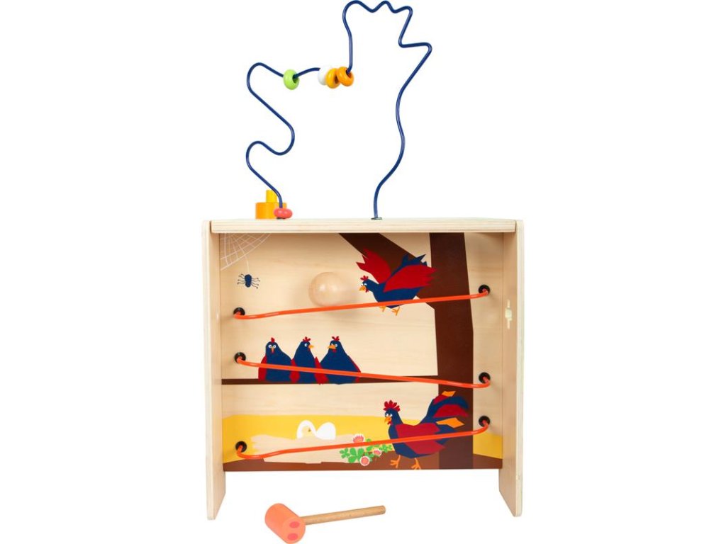 Korálkové bludisko v tvare sliepky, skladačka, posúvanie dielikov, hra na porovnávanie farieb, zatĺkanie, deti sa môžu hrať na všetkých piatich stranách kocky.