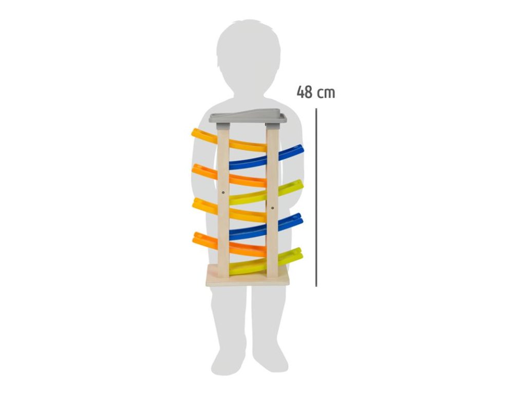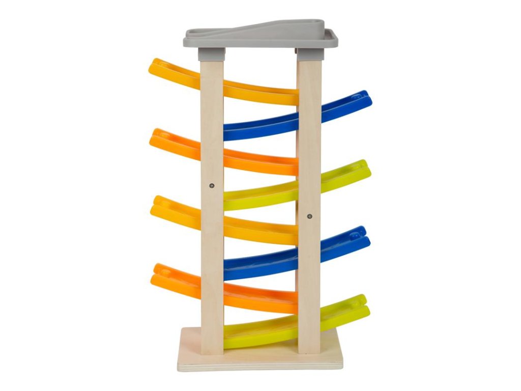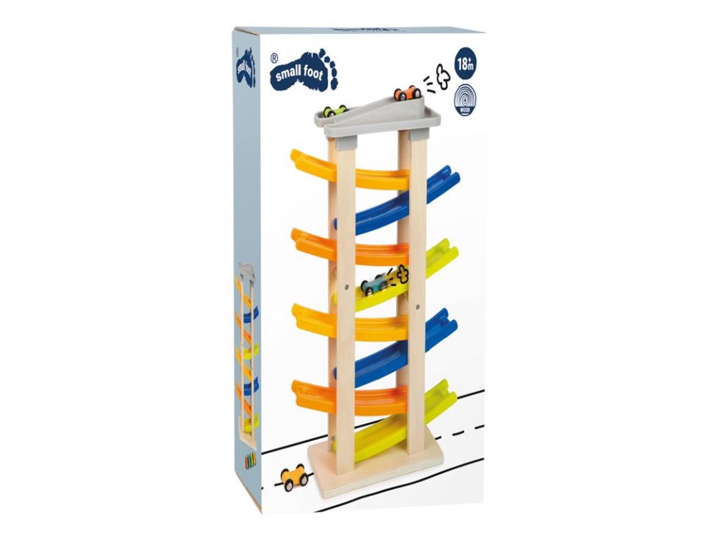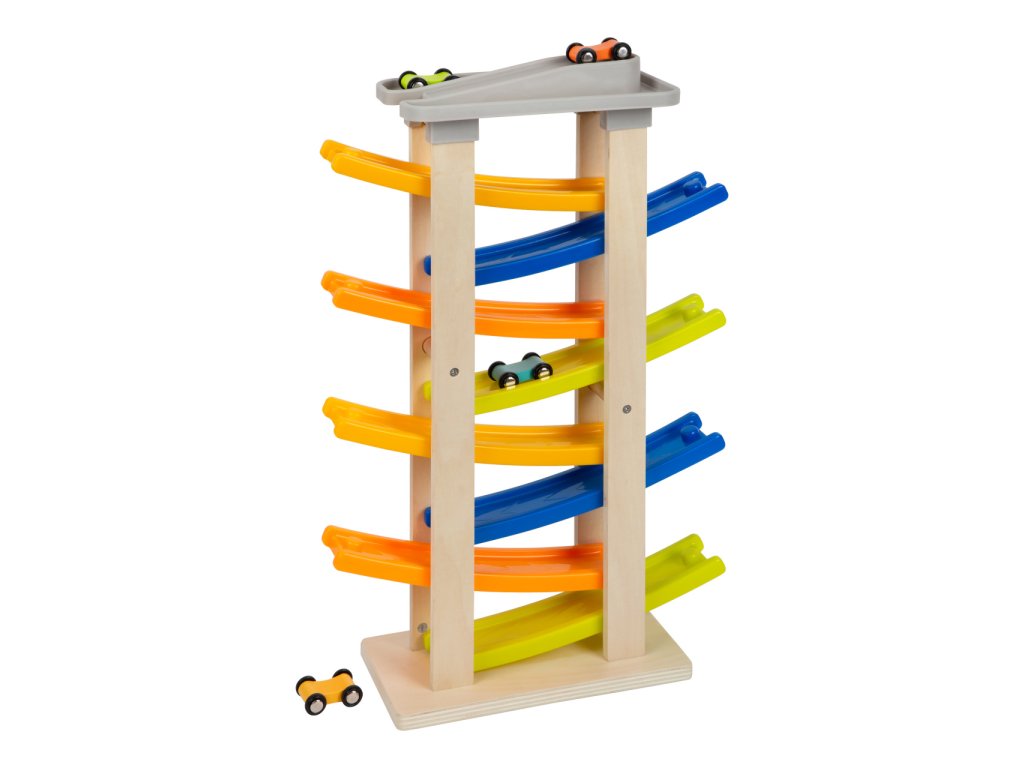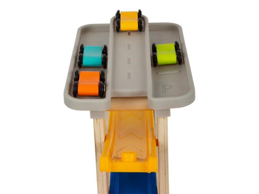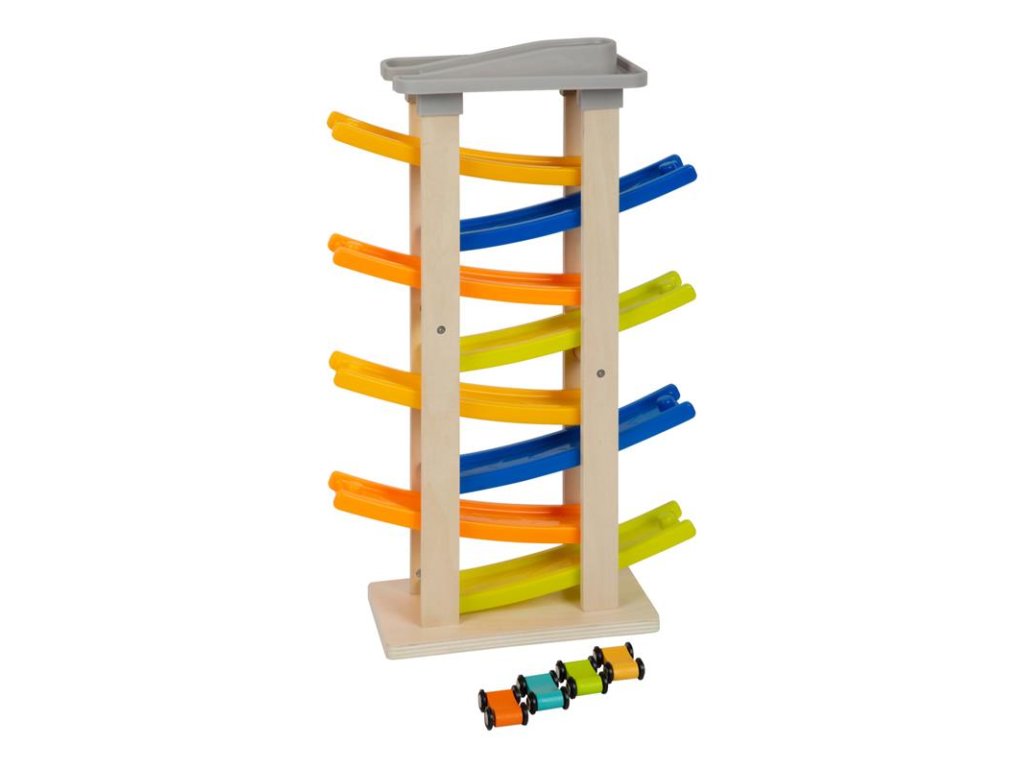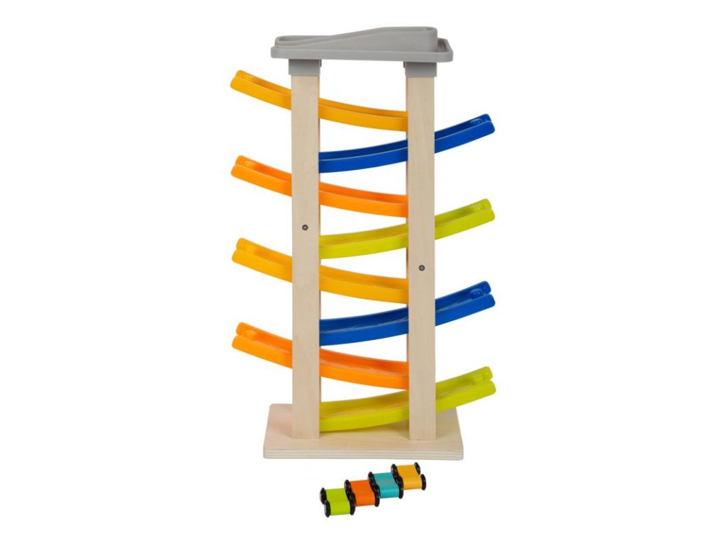Nezvyčajne vysoká pretekárska dráha s ôsmimi rampami a výjazdom na ulicu! Na najvyššom poschodí sa nachádza parkovisko so štyrmi farebnými drevenými autíčkami. Klapavé zvuky, ktoré autíčka vydávajú pri zjazde z rampy, stimulujú akustické vnímanie detí. Okrem toho hračka trénuje motorické zručnosti a koordináciu oko-ruka. Má širokú základňu, takže je veľmi stabilná, a je vyrobená z prírodného neošetreného dreva a pevného plastu. Farebný dizajn vhodný pre deti. Hlavné vlastnosti: - detská hračka, ktorá je vhodná na hranie, - detská hračka, ktorá je vhodná na hranieDodatočné parametre