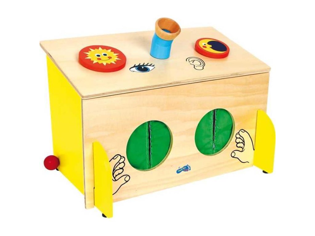 2 textilom vystlané otvory umožňujú rukám prístup do škatule, 2 prizmatické šošovky umožňujú očiam vycítiť, čo je vnútri, a malý lievik vo veku umožňuje počúvať, čo sa v škatuli skrýva.