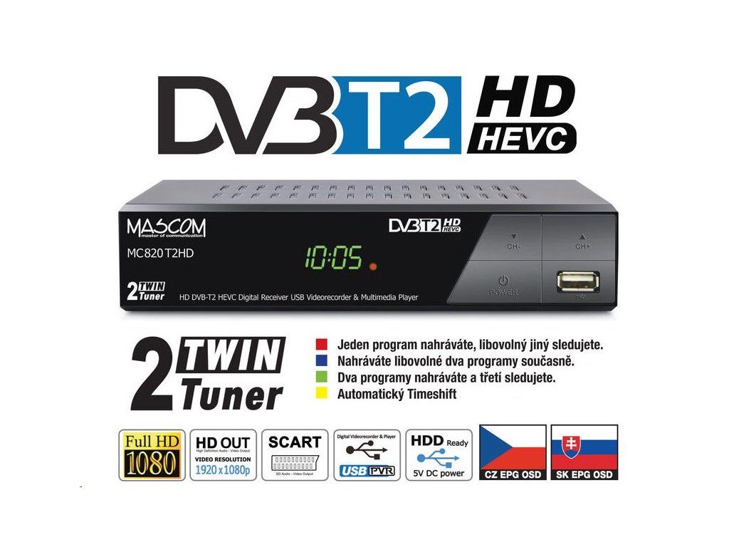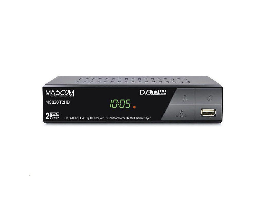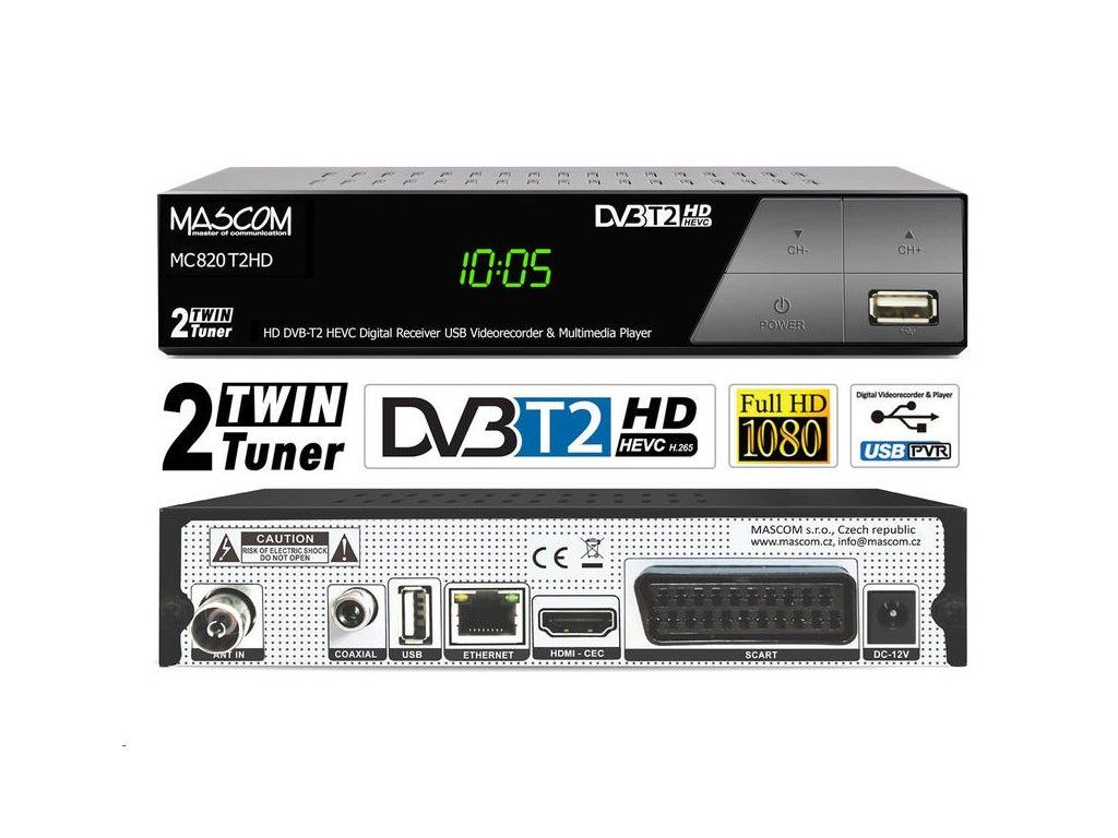 MASCOM MC820T2 sa bez problémov pripojí k akémukoľvek televízoru, anténe a ďalšej elektronike. Po zapojení ho ľahko uvediete do prevádzky pomocou intuitívneho českého menu, inštalačného sprievodcu a automatického ladenia programov.