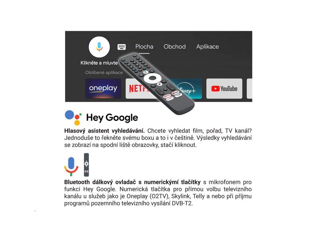 - Bluetooth dálkový ovladač s mikrofonem – hlasové ovládání "Hey Google"