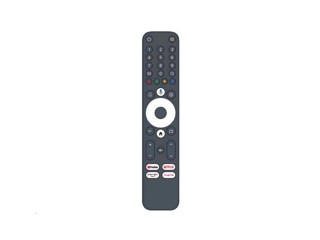 MASCOM SUNNY-T myslí i na pohodlí. Jeho Bluetooth dálkový ovladač má nejen mikrofon pro hlasové ovládání, ale i numerická tlačítka pro rychlou volbu TV kanálů u služeb jako Oneplay, Skylink nebo Telly. Dále nabízí přímý vstup na Netflix, YouTube, Google Play nebo Prime Video.