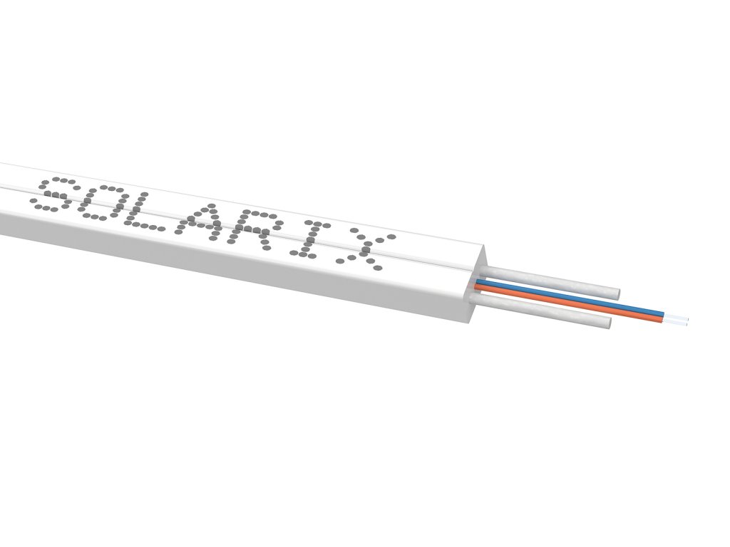 Optický plochý drop kabel Solarix SXKO-MDIC-OS-LSOH s třídou reakce na oheň Eca pro vnitřní použití. Kabel je ideální pro FTTH aplikace díky excelentním instalačním vlastnostem. Samotný vnější plášť optického kabelu je typu LSOH, je tedy v případě vznícení nízkodýmavý a bezhalogenní. Kabel obsahuje dva tahové členy po stranách kabelu a samotná vlákna jsou uložena mezi těmito tahovými členy tak, aby byla dostatečně chráněna. Vlákna jsou díky konstrukci kabelu jednoduše přístupná bez potřeby použití stripovacího nástroje. Samotné vlákno je typu G.657.A1 a je plně kompatibilní s vlákny G.652.D. Kabel je dodáván s odvíjecí cívkou uvnitř boxu pro jednodušší instalaci.- Typ kabelu: MDIC