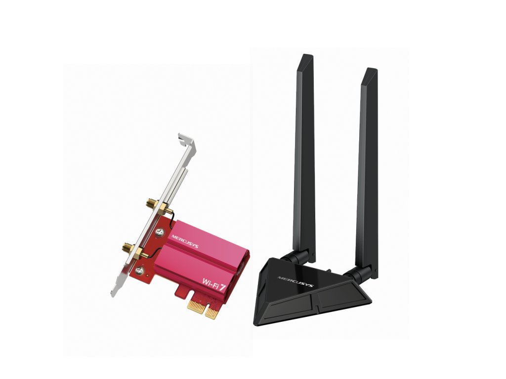 MA49BE BE9300 Wi-Fi 7 Bluetooth 5.4 PCIe adaptér Vysoce výkonný síťový adaptér pro stolní počítače, který přináší revoluční technologii Wi-Fi 7 a nejnovější standard Bluetooth 5.4 pro bleskové připojení a minimální latenci. Bezdrátová síť *Standard: Wi-Fi 7 (IEEE 802.11be/ax/ac/n/a/b/g) *Frekvence: 6 GHz, 5 GHz, 2,4 GHz *Zabezpečení: WPA, WPA2, WPA3-Personal *Rychlost Wi-Fi: 6 GHz: až 5760 Mb/s, 5 GHz: až 2880 Mb/s, 2,4 GHz: až 574 Mb/s Výkon a kapacita *Šířka kanálu: až 320 MHz (6 GHz) *Technologie: MLO (Multi-Link Operation), 4K-QAM, Multi-RU, MU-MIMO *Bluetooth: Verze 5.4 (vyšší rychlost, stabilita a nižší latence pro periferie) *Vlastnosti: Výrazné snížení latence v režimu Wi-Fi 7 pro náročné hraní a VR Porty a hardware *Rozhraní: PCI Express x1 *Antény: 2× externí vysokoziskové antény s magnetickou základnou *LED: Indikace stavu napájení a aktivity *Chlazení: Specializovaný pasivní chladič pro optimální odvod tepla Režimy provozu *Režim stanice (Příjem Wi-Fi signálu) *Bluetooth adaptér pro připojení sluchátek, klávesnic a dalších zařízení Zabezpečení *WPA3: Nejnovější úroveň zabezpečení sítě pro ochranu hesel a dat *Šifrování: 64/128 bitové WEP, WPA/WAP2/WPA3, WPA-PSK/WPA2-PSK/WPA3-SAE Software a správa *Podporované systémy: Pouze Windows 11 (64-bit) – vyžadováno pro plnou podporu Wi-Fi 7 *Instalace: Ovladače na přiloženém médiu nebo ke stažení na webu výrobce *Bluetooth konfigurace: Standardní správa v rámci systému Windows Fyzické parametry *Provedení: PCIe karta s nízkoprofilovou i standardní záslepkou *Anténní základna: Magnetická s prodlužovacím kabelem pro optimální umístění Obsah balení *MA49BE Kit: 1× PCIe adaptér MA49BE, 1× magnetická anténní základna s kabelem, 2× anténa, 1× Low-Profile záslepka, 1× Bluetooth Header kabel, stručný návod Provozní podmínky *Provozní teplota: 0 °C až 40 °C *Vlhkost: 10 % až 90 % RH (nekondenzující) Odkaz na web výrobce: https://www.mercusys.com/cz/product/details/ma49be/Dodatočné parametre