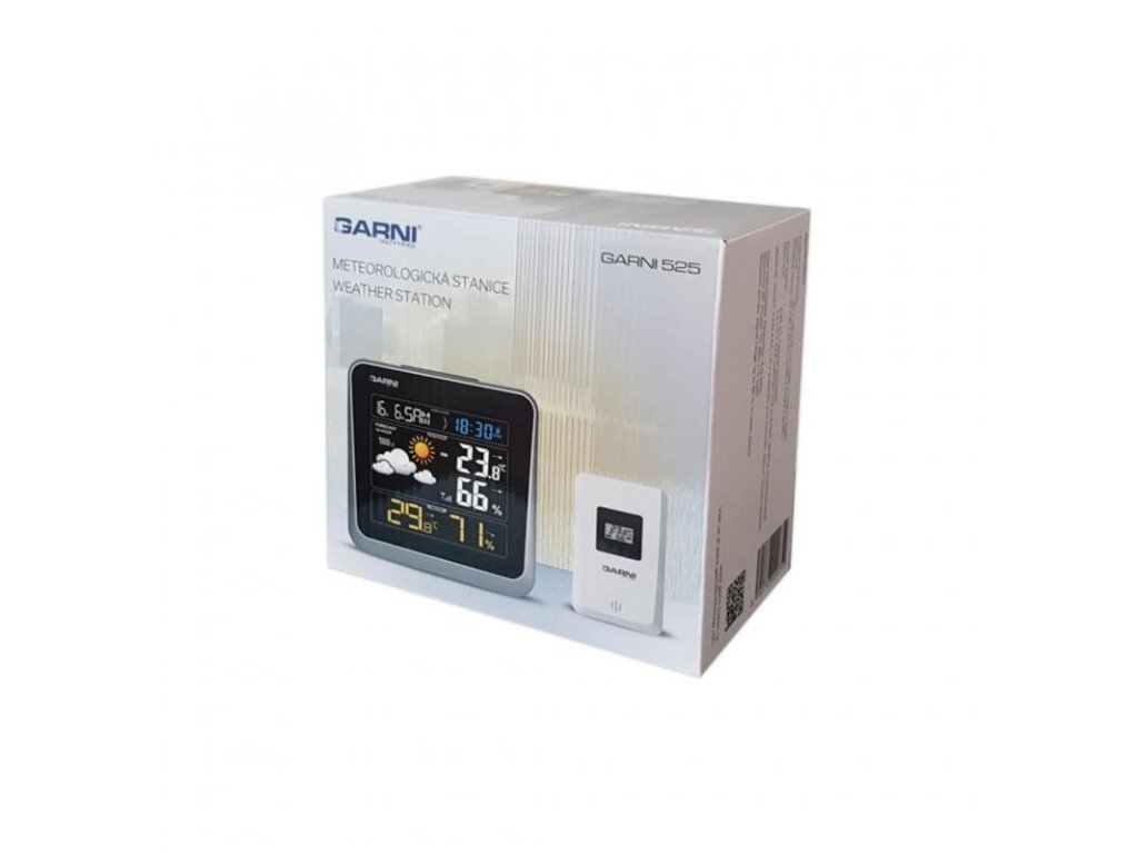 Meteorologická stanica so špičkovým inverzným farebným VA displejom s časom a dátumom riadeným rádiovým signálom DCF-77, budíkom, meraním vnútornej teploty, relatívnej vlhkosti a absolútneho barometrického tlaku a bezdrôtovým senzorom na meranie vonkajšej teploty a relatívnej vlhkosti.