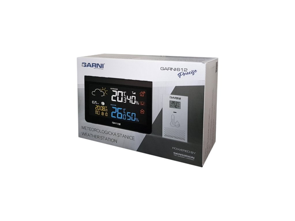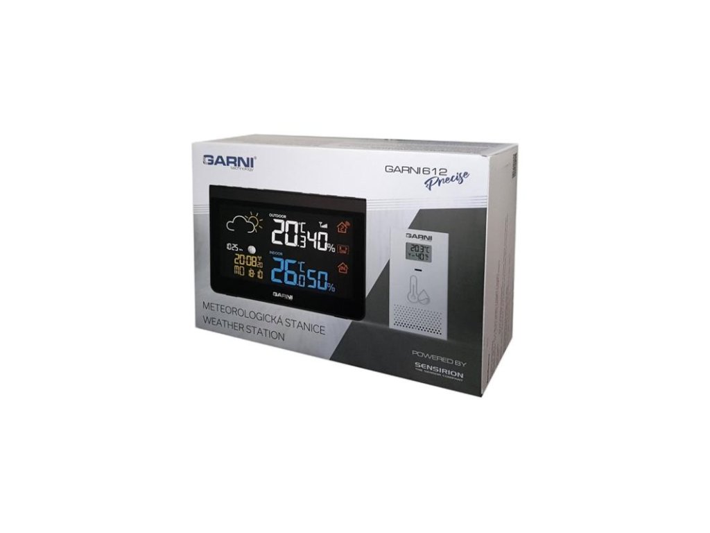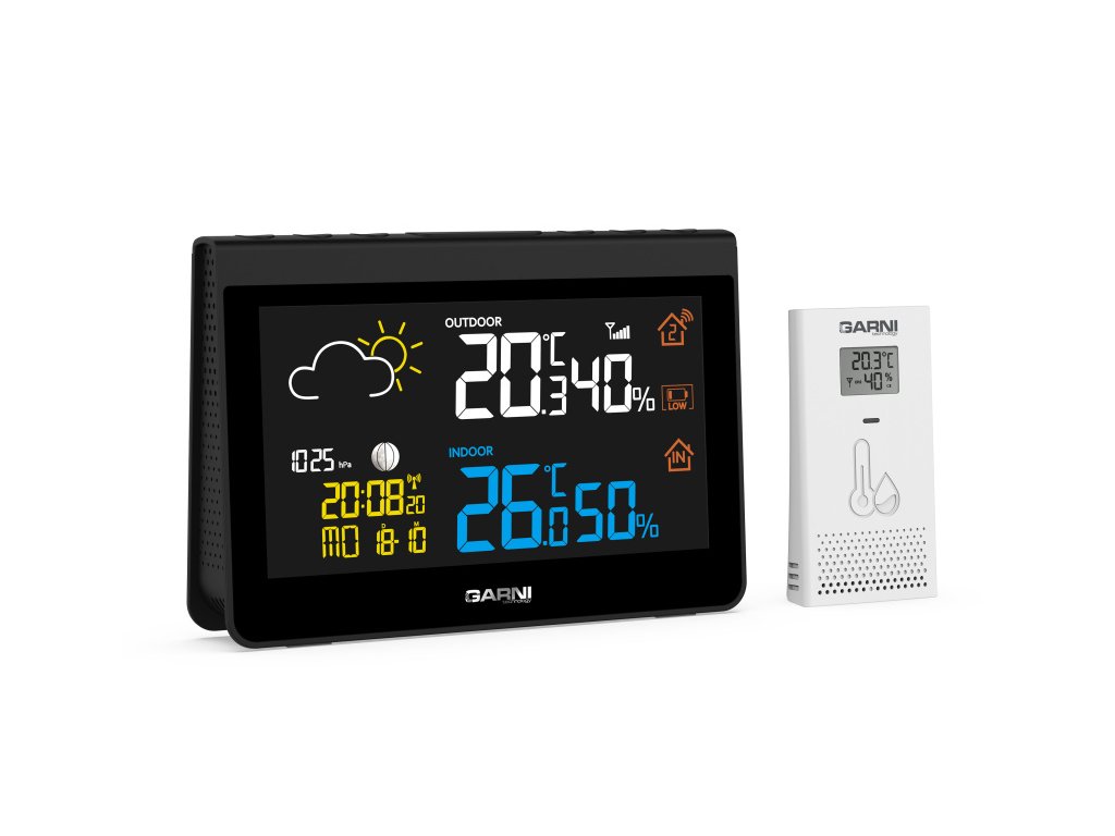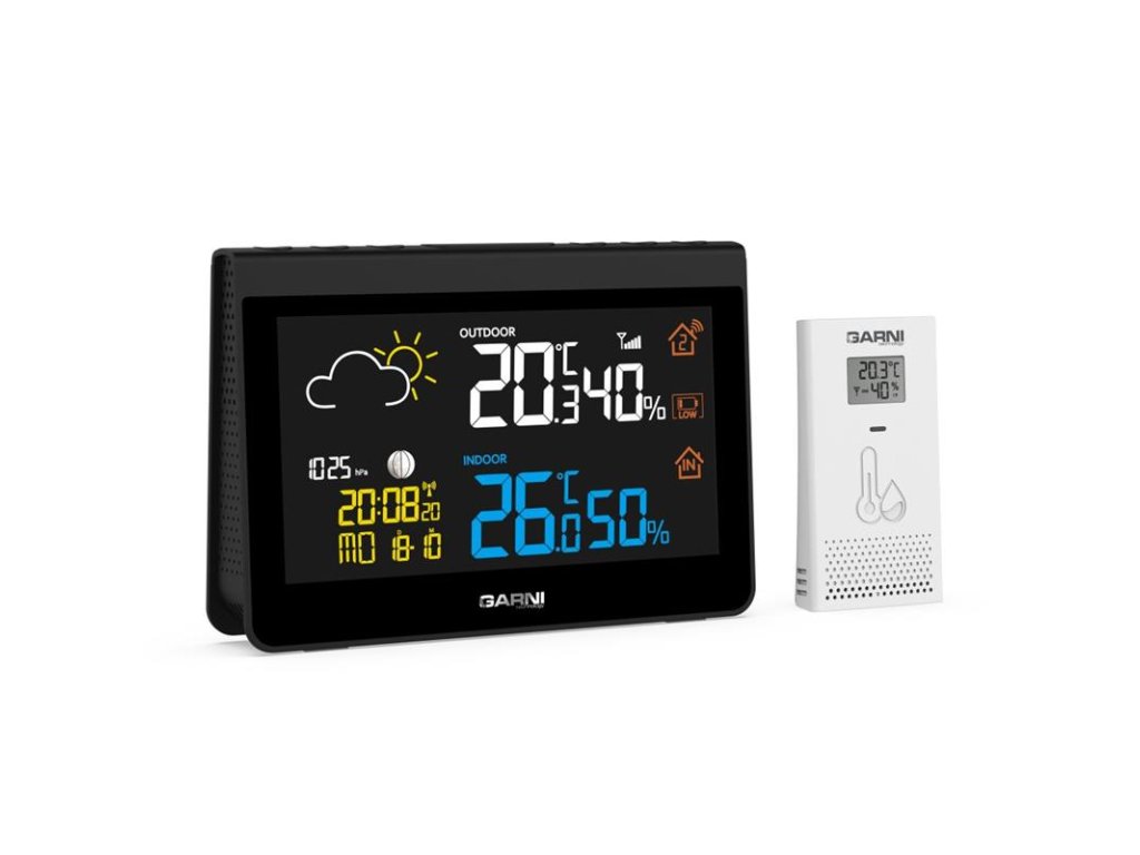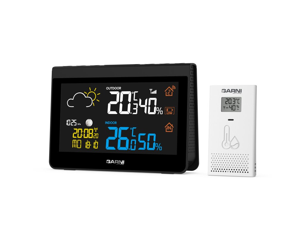 Moderná a presná meteorologická stanica s inverzným farebným VA displejom, zobrazením času a dátumu, budíkom, vnútornou teplotou, relatívnou vlhkosťou, barometrickým tlakom a bezdrôtovým senzorom na meranie vonkajšej teploty a relatívnej vlhkosti. Stanica sa ovláda pomocou rádiového signálu DCF-77.Švajčiarsky snímač