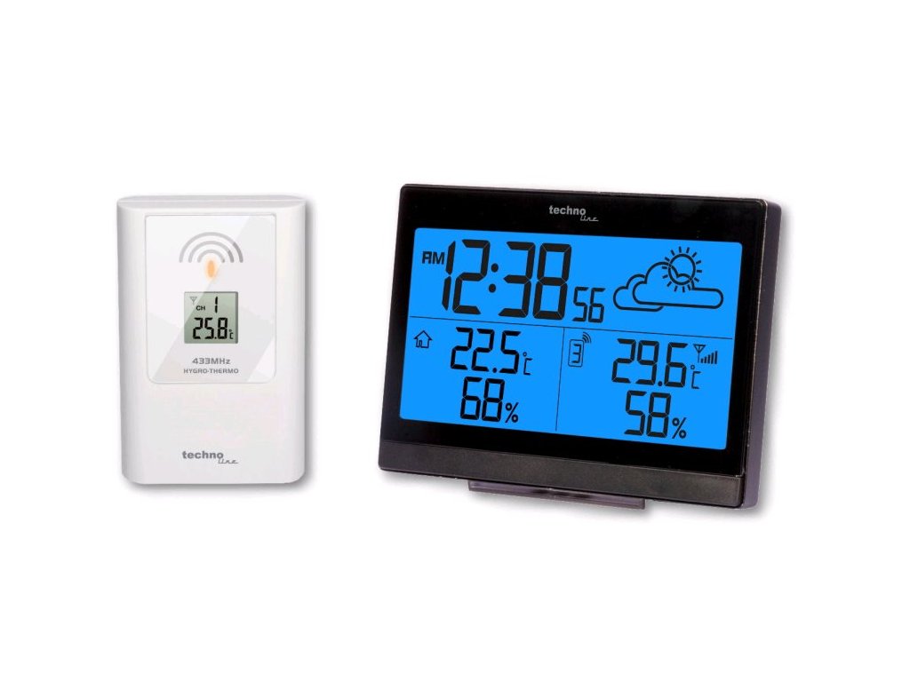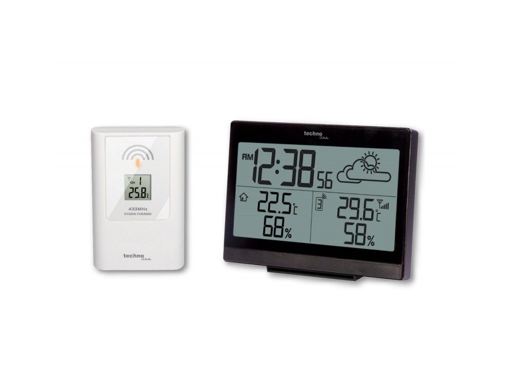 Elegantná meteostanica s veľkým modro podsvieteným displejom, ktorý zobrazuje vnútornú a vonkajšiu teplotu, vlhkosť a ikonu predpovede počasia. POPIS - veľkosť displeja hlavnej jednotky 64 x 124 mm - veľkosť číslic - čas 25 mm, teplota a relatívna vlhkosť 14 mm - displej sa môže na 5 sekúnd krátko rozsvietiť modrou farbou - 4 animované ikony predpovede počasia (slnečno, mierne zamračené, zamračené, daždivé) - predpoveď počasia na základe vývoja barometrického tlaku - zobrazenie vnútornej a vonkajšej teploty a relatívnej vlhkosti - zobrazenie teploty v °C alebo °F - bezdrôtový prenos hodnôt vonkajšej teploty na frekvencii 433 MHz - dosah signálu bezdrôtového snímača do 50 m na otvorenom priestranstve - ikona príjmu signálu bezdrôtového snímača - pamäť pre maximálne a minimálne namerané hodnoty vnútornej a vonkajšej teploty a relatívnej vlhkosti - čas riadený rádiovým signálom DCF-77 - ikona príjmu signálu DCF-77 - možnosť manuálneho nastavenia času - časové pásmo (-23 hodín, +23 hodín) - indikácia možnosti vzniku námrazy pri vonkajšej teplote -2 °C až +3 °C - ikona indikácie slabej batérie bezdrôtového snímača - 12- alebo 24-hodinový formát zobrazenia času - možnosť polohovania Model bezdrôtového snímača TX108DTH - displej s rozmermi 18 x 18 mm - veľkosť číslic 7,5 mm - zobrazenie teploty alebo relatívnej vlhkosti - farba biela - vodotesný kryt - závesný alebo stojanový TECHNICKÉ PARAMETRE - Rozsah/tolerancia merania vnútornej teploty -40°C až +70°C ±1°C (odporúčaný rozsah 0°C až +45°C) - Rozlíšenie vnútornej teploty 0,1 °C - Rozsah/tolerancia merania vonkajšej teploty -40°C až +70°C ±1°C (odporúčaný rozsah -20°C až +55°C) - Rozlíšenie vonkajšej teploty 0,1°C - Vnútorný rozsah merania relatívnej vlhkosti / tolerancia 20 % až 90 % ±5 % - Vnútorné rozlíšenie relatívnej vlhkosti 1% - Rozsah/tolerancia merania vonkajšej relatívnej vlhkosti 20 % až 90 % ±5 % - Rozlíšenie externej relatívnej vlhkosti 1% - Princíp predpovede počasia na základe zmien tlaku v baroch - Počet ikon predpovede počasia 4 (slnečno, mierne zamračené, zamračené, daždivé) - Dosah signálu bezdrôtového snímača do 50 m v otvorenom priestore - Interval prenosu údajov Interval merania približne 60 až 64 s - Frekvencia prenosu bezdrôtového snímača 433 MHz - Počet kanálov 3 - Pamäť pre maximálne a minimálne namerané hodnoty áno - Indikácia mrazu áno, s ikonou v rozsahu vonkajšej teploty -2 °C až +3 °C - Čas áno, riadený signálom DCF-77 - Formát času 12/24 hodín - Budík áno - Opakované budenie (Snooze) áno, po 5 minútach - Časové pásmo áno, od -23 do +23 hodín - Rozmery displeja hlavnej jednotky 64 x 124 mm - Veľkosť číslic - čas hlavnej jednotky 25 mm, teplota, relatívna vlhkosť 14 mm - Osvetlenie displeja hlavnej jednotky áno, krátkodobé modré na 5 sekúnd - Displej bezdrôtového snímača áno - Rozmery displeja bezdrôtového snímača 18 x 18 mm - Veľkosť číslice - bezdrôtový snímač 7,5 mm - Napájanie hlavnej jednotky 2 ks 1,5 V batérií typu AA (tužkové, nie sú súčasťou dodávky) - bezdrôtový snímač 2 ks 1,5 V batérií AA (typ AA, nie sú súčasťou dodávky) - Celkové rozmery hlavnej jednotky 140 x 100 x 47 mm - bezdrôtový snímač 100 x 65 x 35 mm Hmotnosť - hlavná jednotka 212 g bez batérií - bezdrôtový snímač 76 g bez batérií - Farba hlavnej jednotky čierna, bezdrôtového snímača biela - Možnosť postaviť / zavesiť hlavnú jednotku áno / nie bezdrôtový snímač áno / ánoDodatočné parametre