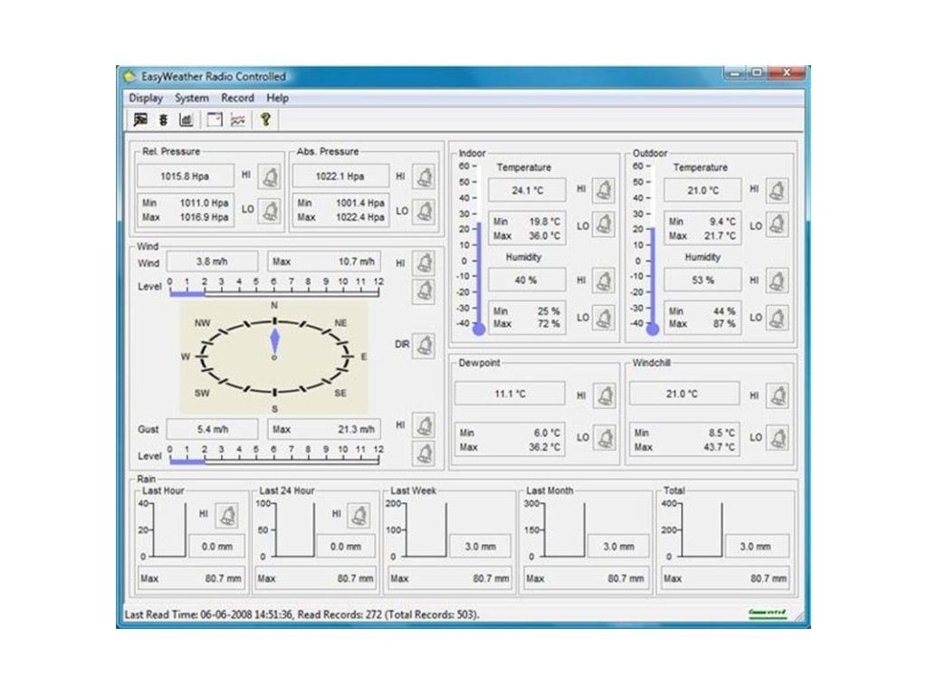 - Programovateľné alarmy pre teplotu, vlhkosť, windchill, rosný bod, zrážky, rýchlosť vetra, smer vetra, barometrický tlak, možnosť búrky