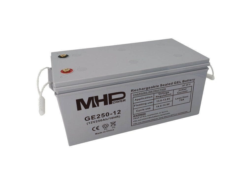 MHPower Gelový akumulátor deep cycle VRLA GEL s pokročilou technologií vazby elektrolytu na křemičitý gel přináší řadu nesporných výhod oproti klasickým akumulátorům s tekutým elektrolytem. Těmi nejvýznamnějšími je absolutní bezúdržbovost po celou dobu životnosti, nízká míra samovybíjení, teplotní stabilita, vysoká odolnost hlubokému vybíjení a následné rychlé „zotavení“, snížený vliv vibrací a mechanického poškození gelem fixovaných desek, nevrstvení elektrolytu se všemi negativy a nízká koroze elektrod a sulfatace. Gelové baterie řady MHPower GE jsou vyráběny se speciálními separátory a silikagelem imobilizujícím elektrolyt uvnitř baterie. Osvědčená technologie silikagelu může zlepšit životnost baterie a výkon v širším teplotním rozsahu. Životnost cyklu hlubokého vybití je zvýšena o 50 % ve srovnání s bateriemi řady MS. Životnost Cyklická životnost: 500 cyklů při 80% vybití, 800 cyklů při 50% vybití a 1600 cyklů při 30% vybití. Životnost 12 let v provozu trvalého (float) dobíjení při 20 °C. Baterie je vhodná jak pro cyklický provoz (vybití-nabití) tak pro trvalé dobíjení s malou mírou vybíjení. Gelová baterie má čtyři speciální výhody: 1. Gelová baterie používá gelový elektrolyt, který může zabránit tepelnému úniku baterie se silnou schopností rozptylu tepla, 2. Gelová baterie používá speciální mřížku ze slitiny vápníku a olova a cínu, odolnější vůči korozi, 3. Gelová baterie používá vysoce pevný separátor, aby se zabránilo zkratu, 4. Gelová baterie je vybavena filtračním zařízením proti výbuchu kyselé mlhy, bezpečnější a spolehlivější. Při výrobě gelových baterií GE jsou použity inovativní technologie výrobců olověných baterií včetně svařování TTP, tepelného těsnění, proces vstřikování pouzdra baterie, mřížky ze slitiny High-Tin, vnitřního formování a svařování odlitků, atp. Výrobce má ve srování s konkurenčními továrnami více plně automatizovaných výrobních linek, které mohou výrazně snížit náklady na materiál a práci, díky čemuž je jejich cena velmi příznivá. Přednosti oproti řadě MS: 1. O 50 % delší životnost než u řady MS. 2. Vysoce čistá slitina olova a cínu, snižuje rychlost samovybíjení baterie a zvyšuje životnost baterie. 3. Pouzdro na baterie ABS vyrobené ze surovin LG pro zvýšení životnosti baterie. 4. Technika tepelného těsnění místo lepení pro zvýšení těsnosti a stability baterie. 5. Technika TTP nejen snižuje vnitřní odpor a náklady na materiál, ale také zvyšuje životnost baterie. Hermeticky uzavřená, bezúdržbová Dlouhá životnost, nízké samovybíjeníDodatočné parametre
