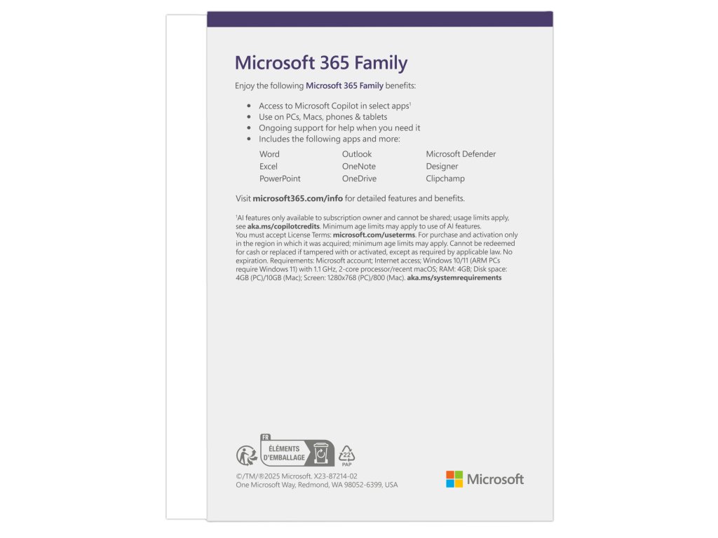 Microsoft 365 pro rodiny je předplatné až pro 1–6 osob, jehož součástí je pokročilé zabezpečení, cloudové úložiště a inovativní aplikace využívající AI.Dodatočné parametre