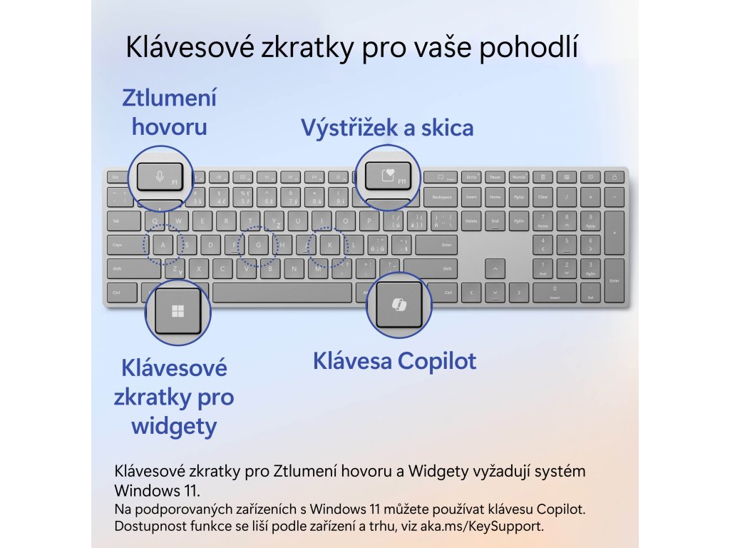 klávesnice Microsoft Surface Keyboard (2. edice) Díky klávese Copilota u klávesnice pro Surface máte ve Windows 11 výhody umělé inteligence na dosah ruky. Tahle elegantní klávesnice umožňuje klasické psaní se zabudovanou numerickou částí a vyhrazenými klávesami pro rychlý přístup k funkcím výstřižky a skica, expresivní vstup, ztlumení hovoru a dalším. Rozměry: 420,9 × 112,6 × 19,3 mm Hmotnost: 419,3 g (s bateriemi) Rozhraní: Bluetooth Low Energy 4.0 Dosah: 10 m ve volném prostoru, až 5 m v typickém kancelářském prostředí Napájení: 2× AAA (součást balení) Výdrž baterií: až 1 rok Barva: šedá Klávesy: * QWERTZ (CZ&SK) * multimediální klávesy: základní (zvýšení/snížení hlasitosti, ztlumení, přehrávání/pozastavení, převinutí zpět/vpřed) * klávesa Copilot pro Windows, Expresivní vstup, Výstřižky/Snímek obrazovky, Ztlumení hovoru a Widgety * funkce šifrování: AES přes Bluetooth LE SSP nebo klíč Kompatibilita: Windows, Android, mac OS X, iOS Odkaz na stránky výrobce a informace o produktu: https://www.microsoft.com/cs-cz/d/klavesnice-surface-keyboard-2-edice/93d9l5tctr0bDodatočné parametre