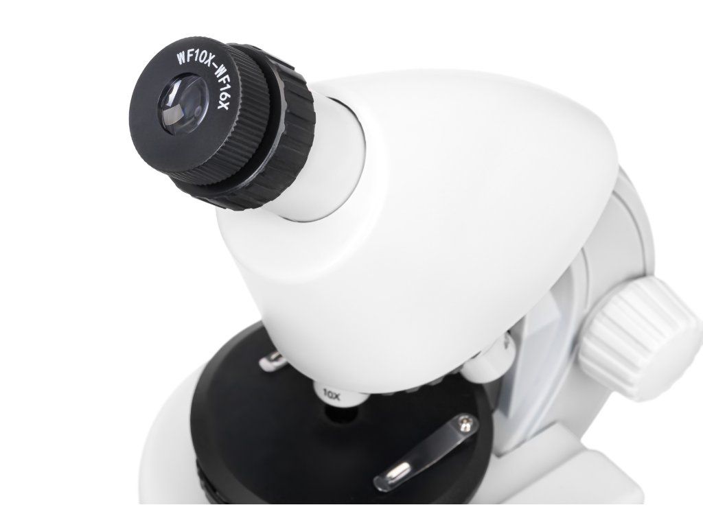 Mikroskop ponúka zväčšenia od 40x do 640x a umožňuje prezeranie mnohých priehľadných vzoriek vrátane drobných vodných organizmov. Ale baktérie nie sú viditeľné – na to sa vyžaduje výkonnejšia optika. Revolverový nosič objektívov obsahuje objektívy s rôznym zväčšením: 4x, 10x a 40x. Okulár je dvojpolohový, t.j. v jednej polohe poskytuje zväčšenie 10x, v druhej 16x. Keďže je neodnímateľný, nemožno ho stratiť. Ostrosť sa nastavuje manuálne pomocou bočných koliesok pre hrubé zaostrenie. Tubus okuláru má sklon 45°, je vhodný pre zdĺhavé pozorovania.