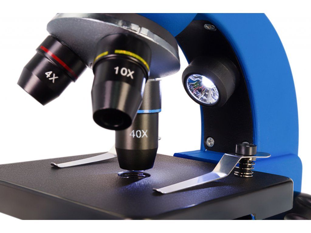 Pracovný stolík mikroskopu má svorky na mikropreparáty a kotúč s clonami - 6 otvormi na nastavenie svetelného toku. Kombinované osvetlenie pozostáva z dvoch LED diód umiestnených nad a pod stolíkom. Vďaka nemu je možné prezerať vzorky akéhokoľvek stupňa transparentnosti. Osvetlenie je napájané štandardnými batériami.