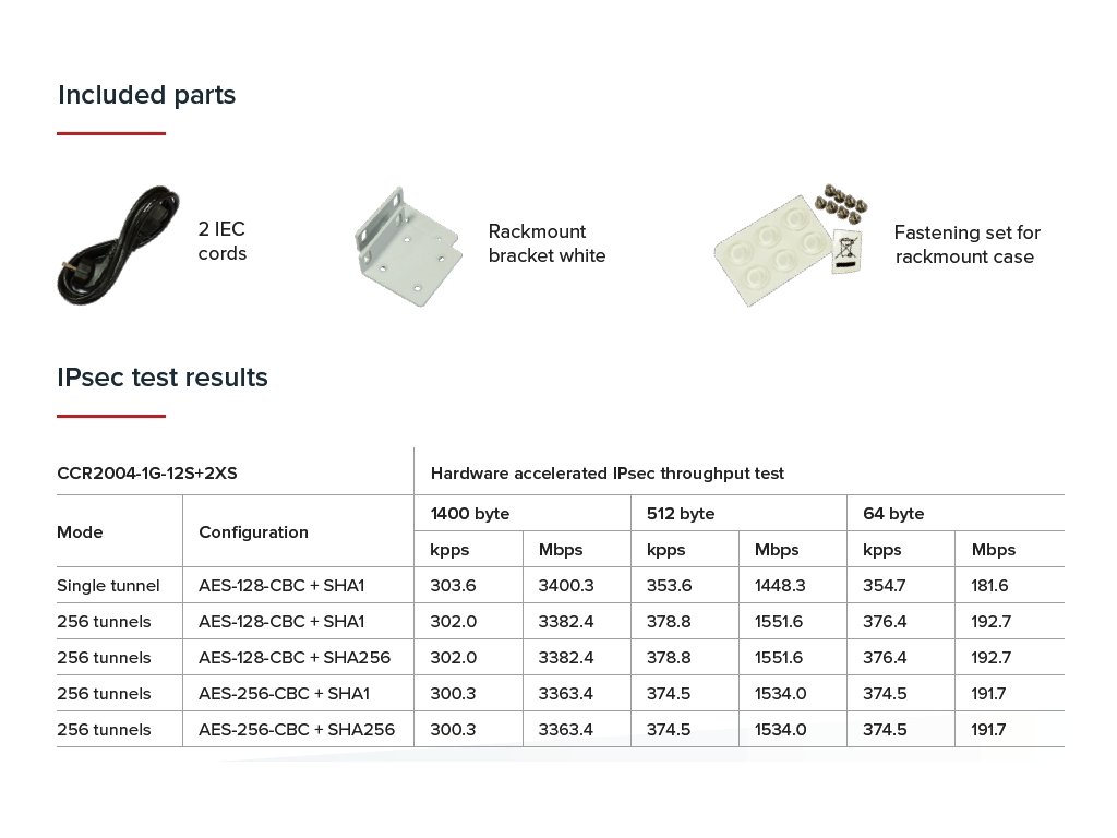 Popis produktu Fráze ''Improvise. Adapt. Overcome.'' je známá a může být v mnoha případech užitečná. Někdy ale jednoduše potřebujete zařízení, které funguje a řeší vaše problémy bez dalšího přemýšlení. Nový router CCR2004-1G-12S+2XS přesně to dělá! Zapomeňte na problémy s výkonem a rozšiřte vaši instalaci podle vašich přání. Tento router disponuje nejvyšším výkonem připadajícím na jedno jádro. Je srovnatelný se známými modely CCR1009/CCR1016. Díky redundantnímu napájení můžete zapomenout na neplánované výpadky. Díky propracované konfiguraci portů jde o perfektní zařízení pro profesionály, kteří to se svojí sítí myslí vážně. K dispozici je 12x SFP+ s rychlostí 10Gbps a 2x SFP28 s rychlostí 25Gbps. V neposlední řadě je zde také jeden ethernetový port 10/100/1000Mbps vhodný např. pro správu zařízení. Stejně tak je možné správu provádět přes seriovou konzoli, pro tento způsob je k dispozici se zakončením RJ45. Předinstalován je operační systém routerOS v6, v kterém se nabídne 128MB vnitřní úložiště a 1792MB DDR4 ECC RAM. Po upgrade na routerOS v7 je k dispozici RAM dokonce 4GB DDR4 ECC! Maximální spotřeba zařízení se drží na přijatelných 49W. Obsah balení (1) Zařízení (2) Napájecí kabel 230V (1) Úchyty do racku (1) Montážní sada Technické parametry Fyzické charakteristiky Provedení: Rackmount Počet ''U'' pozic: 1 Ventilátory: (2) 40 x 40 mm Tlačítka: Reset Provozní teplota [°C]: -20 až 60 Hloubka [mm]: 224 Šířka [mm]: 443 Výška [mm]: 44 Hardware RAM [MB]: 4096 CPU: AL32400 Frekvence CPU [MHz]: 1700 Počet CPU jader: 4 Velikost interního uložiště [MB]: 128 Konektory a rozhraní Sériový port: RJ45 Rychlosti LAN: (1) 10/100/1000Mbps Gigabit LAN: Ano Optické rozhraní: (12) 10G + (2) 25G Napájení Typ napájení: Ze sítě (230V) Max. spotřeba energie [W]: 49 Software Možnost více WAN: Ano Operační systém: RouterOS - L6 Podpora IPv6: Ano Výchozí IP adresa: 192.168.88.1 Výchozí jméno a heslo: admin / -Dodatočné parametre