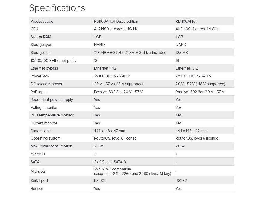 Verze bez disku Systémové řešení platforem firmy MikroTik pro poskytovatele bezdrátového připojení k síti Internet. Jedná se o gigabitový routerboard v rack verzi osazený 13x RJ45 10/100/1000 Mbps MDI/MDI-X. Aktivovaný ROS Level 6, slot pro SD kartu, seriový port RS232, dodávka včetně 1U hliníkové rack šasi a zdroje. Poháněný Annapurna Alpine AL21400 CPU se čtyřmi Cortex A15 jádry, každý taktován na 1.4GHz a propustností až 7.5Gbit. RB podporuje IPsec hardware acceleration (až 2.2Gbps s AES128). Kromě redundantního napájení má ještě DC vstup a podporuje jak pasivní tak i aktivní PoE nápájení ve standardu 802.3at. RouterBoard lze dále rozšířit o mikroSD kartu, díky integrovanému hardwarovému akcelerátoru je ideální pro IPsec tunely. Technické specifikace: DHCP: Ano LAN porty: 13x 10/100/1000 Mbit/s Gigabit Ethernet, Auto-MDI/X Výchozí jméno: admin Spotřeba (W): 25 Procesor: PowerPC 4x 1400MHz with hardware encryption NAND (MB): 128 Rozšíření: 1x micro SD card I/O Control: Ano LED indikace: Ano OS: RouterOS Level 6 Podpora IPv6: Plná Výška (mm): 47 Šířka (mm): 444 Hloubka (mm): 148 Napájení max (jack) (V): 2x 230, 57 Napájení min (PoE) (V): 20 Napájení max (PoE) (V): 57 Provozní teplota min (°C): -20 Chlazení: Pasivní (bez ventilátoru) Upozornění: Výrobce MIKROTIK nevztahuje záruku na zařízení poškozená přepětím. Zařízení je třeba na vstupech adekvátně chránit proti indukovanému elektrostatickému přepětí či přepěťovým špičkám na silovém vedení. Při venkovních instalacích je třeba používat stíněnou kabeláž (FTP/SFTP), příslušné přepěťové ochrany (pokud nejsou integrovány) a provést korektní a efektivní uzemnění. Stránky o produktu: https://routerboard.com/RB1100Dx4Dodatočné parametre