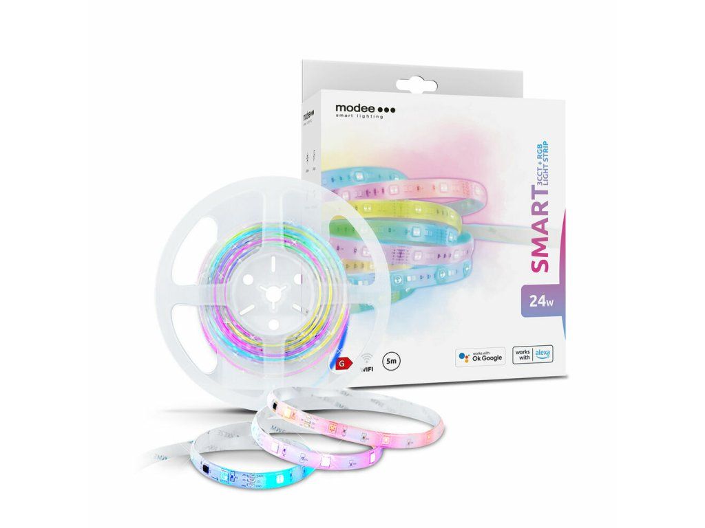 LED pásik Modee Lighting LED Smart (Tuya Wi-Fi) Strip s výkonom 3,4W/m, ktorý možno ovládať cez pripojenie k WiFi mobilným telefónom alebo tabletom a nastaviť farebnú teplotu svetla v širokom rozsahu (2700 - 6000K). Možno si zvoliť aj farbu, akou bude žiarovka svietiť (výber zo 16 milión farieb).