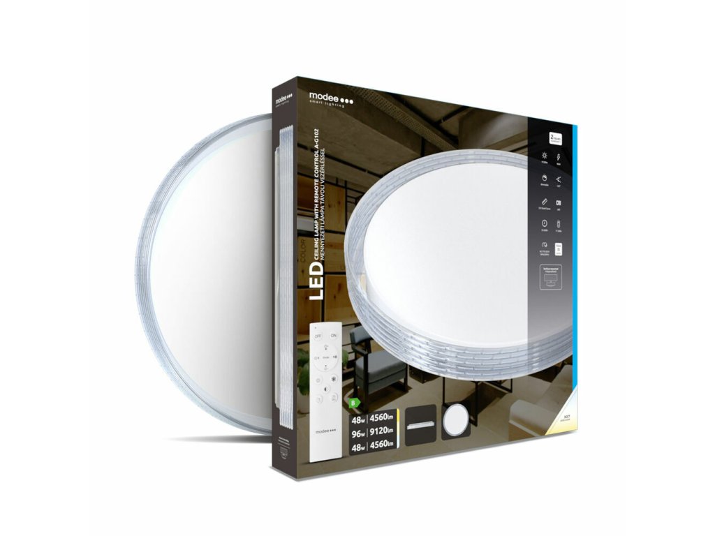 Stropné kruhové LED svietidlo Modee Smart Lighting Ceiling Lamp A-G102 2x48W 3CCT 510x510x75mm + rem. 9120 lm s LED technológiou SMD, ktorá je úspornejšia. Kruhové tienidlo lampy z mliečneho skla je zdobené priehľadným rámom pripomínajúcim sklo.