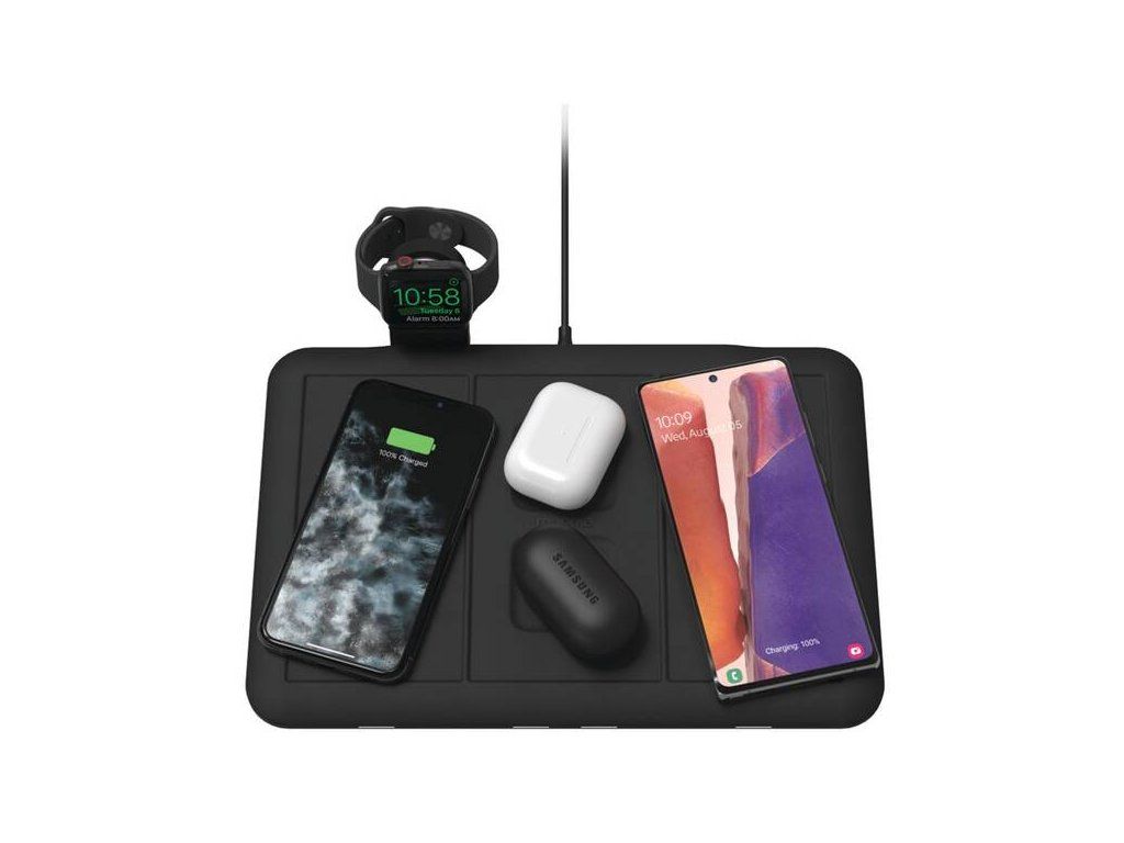 Mophie 4v1 Wireless Charging Pad – stylové nabíjení více zařízení S bezdrátovou nabíjecí podložkou Mophie 4v1 dodáte energii hned několika zařízením současně. Podložka nabízí 4 zóny pro bezdrátové Qi nabíjení , takže můžete nabíjet telefony, sluchátka a další kompatibilní zařízení. Nechybí integrovaný stojánek pro Apple Watch a USB-A port , který lze využít pro nabíjení dalšího zařízení nebo samotné podložky. Celkový výkon dosahuje 10 W a nabíjení je možné i s pouzdrem na zařízení, pokud není tlustší než 3 mm . Povrch podložky je opatřen kvalitní textilií , která chrání zařízení před poškrábáním, zatímco spodní strana má protiskluzový povrch pro maximální stabilitu. Klíčové vlastnosti 4 zóny pro Qi nabíjení – nabíjejte více zařízení současně. Integrovaný stojánek pro Apple Watch . USB-A port pro další zařízení nebo napájení podložky. Celkový výkon 10 W . Textilní povrch proti poškrábání. Protiskluzová základna pro bezpečné použití.Dodatočné parametre