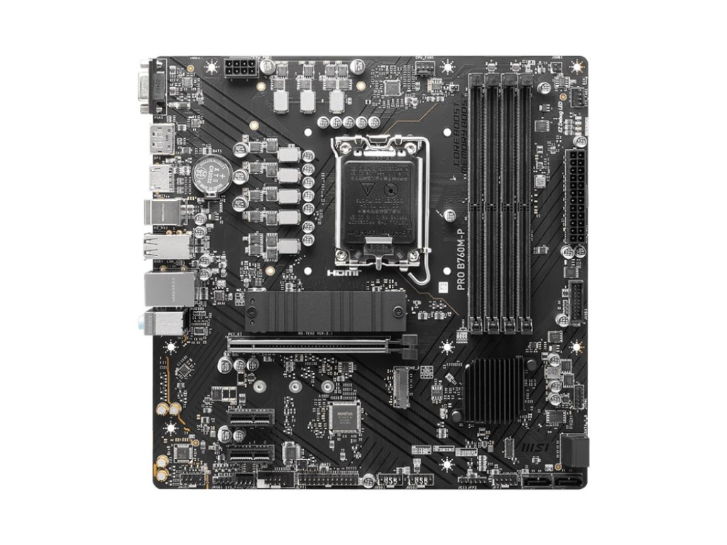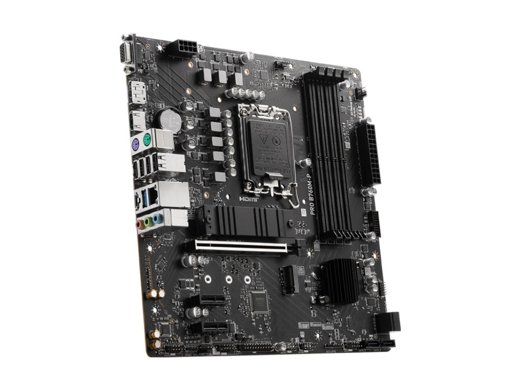 MSI PRO B760M-P Chipset: Intel® B760 Rozměrový formát: mATX (243,84x243,84mm) Podpora pro procesory: Intel® Core™ 14./13./12. generace, Intel® Pentium® Gold a Celeron® Patice procesoru: LGA1700 Paměť: * 4x paměťový slot DDR5, maximální kapacita 192GB * DDR5 6800+(OC)/6600(OC)/6400(OC)/6200(OC)/6000(OC)/5800(OC)/5600(JEDEC)/5400(JEDEC)/5200(JEDEC)/5000(JEDEC)/4800(JEDEC)MT/s * Intel® XMP 3.0 OC Grafické výstupy: * 1x HDMI™ * 1x DisplayPort * 1x VGA Zvuková karta: 7.1-Channel High Definition Audio, kodek Realtek® ALC897 Ethernet: Realtek® RTL8111H GbE LAN WLAN + Bluetooth: ne Rozšiřující sloty: * 1x PCI-E x16 (PCI_E1 PCIe 4.0 podporuje až x16) * 2x PCI-E x1 (PCI_E2, PCI_E3 PCIe 4.0 podporuje až x1) Úložný prostor: celkem podporuje 2 sloty M.2 a 4 porty SATA 6Gb/s * 1x M.2_1, M key, typ 2280/2260/2242 - podpora PCIe 4.0 x4 * 1x M.2_2, M key, typ 2280/2260/2242 + SATA a podpora PCIe 4.0 x4 * 4x port SATA 6Gb/s RAID řadič: podpora RAID 0/1/5/10 pro úložná zařízení SATA USB: Zadní USB (celkem 6 portů) * 1x USB 3.2 Gen2 typ C * 1x USB 3.2 Gen1 typ A * 4x USB 2.0 Přední USB (celkem 6 portů) * 2x USB 3.2 Gen1 typ A * 4x USB 2.0 Porty na zadním panelu: * 1x USB 3.2 Gen 2 10Gb/s (typ C) * 1x USB 3.2 Gen 1 5Gb/s (typ A) * 4x USB 2.0 * 1x HDMI® * 1x DisplayPort * 1x VGA * 1x RJ-45 * 2x PS/2 pro klávesnici a myš * 3x audio jack Interní porty: Napájení * 1x napájecí konektor (ATX_PWR) * 1x napájecí konektor (CPU_PWR) Související s ventilátorem a chlazením * 1x ventilátor CPU * 2x ventilátor systému Související s úložištěm * 4x SATA 6Gb/s konektor * 2x slot M.2 USB * 2x USB 3.2 Gen1 typ A * 4x USB 2.0 Osvětlení LED * 1x RGB LED konektor (JRGB) * 4x EZ Debug LED Ostatní * 2x Front Panel (JFP) * 1x Chassis Intrusion (JCI) * 1x Front Audio (JAUD) * 1x Printer Port (JLPT) * 1x Com Port (JCOM) * 1x TPM pin header (podpora TPM 2.0) Příslušenství: * kabel SATA * I/O záslepka * 2x M.2 šroub/standoff set * uživatelská příručka Odkaz na stránku výrobce: https://www.msi.com/Motherboard/PRO-B760M-P/Dodatočné parametre