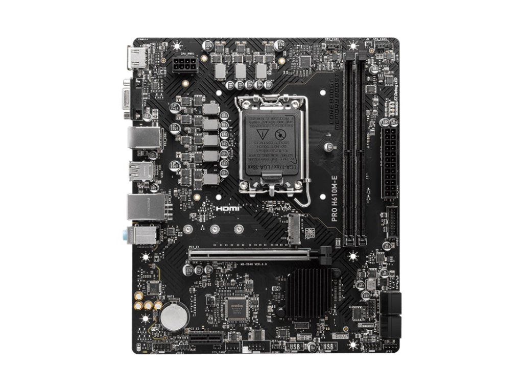 MSI PRO H610M-E Chipset: Intel® H610 Rozměrový formát: mATX (236,16x200mm) Podpora pro procesory: 14., 13. a 12. generace Intel® Core™, Pentium® Gold a Celeron® Patice procesoru: LGA1700 Paměť: * 2x paměťový slot DDR5, podpora až 96GB, DDR5 5600MT/s (JEDEC & POR) * dvoukanálová architektura paměti * XMP 3.0 OC Grafické porty: (Specifikace grafiky se mohou lišit v závislosti na nainstalovaném CPU.) * 1x HDMI™ 1.4 s HDR * 1x VGA Zvuková karta: kodek Realtek® ALC897 7.1kanálový zvuk s vysokým rozlišením Ethernet: Realtek® RTL8111H GbE LAN WLAN + Bluetooth: ne Rozšiřující sloty: * 1x PCIe x16 (podporuje až PCIe 4.0 x16) * 1x PCIe x1 (podporuje PCIe 3.0 x1) Úložný prostor: celkem podporuje 1 slot M.2 a 4 porty SATA 6Gb/s * 1x M.2, M key, typ 2280/2260/2242 - podpora PCIe 3.0 x4 * 4x port SATA 6Gb/s USB: Zadní USB (celkem 6 portů) * 2x USB 3.2 Gen1 typu A * 4x USB 2.0 Přední USB (celkem 6 portů) * 2x USB 3.2 Gen1 typu A * 4x USB 2.0 Porty na zadním panelu: * 2x USB 3.2 Gen1 typu A * 4x USB 2.0 * 1x HDMI® * 1x VGA * 1x RJ-45 * 1x PS/2 pro klávesnici a myš * 3x audio jack Interní porty: Napájení * 1x napájecí konektor (ATX_PWR) * 1x napájecí konektor (CPU_PWR) Související s ventilátorem a chlazením * 1x ventilátor CPU * 2x systémový ventilátor Související s úložištěm * 4x SATA 6Gb/s konektor * 1x slot M.2 (M-Key) USB * 2x USB 3.2 Gen1 typu A * 4x USB 2.0 Osvětlení LED * 1x RGB LED connector(JRGB) * 4x EZ Debug LED Ostatní * 2x Front Panel (JFP) * 1x Chassis Intrusion (JCI) * 1x Front Audio (JAUD) * 1x Com Port (JCOM) * 1x TPM pin header (Support TPM 2.0) Příslušenství: * SATA 6Gb/s kabel * I/O záslepka * šroub M.2 - set * uživatelská příručka Odkaz na stránku výrobce: https://www.msi.com/Motherboard/PRO-H610M-EDodatočné parametre