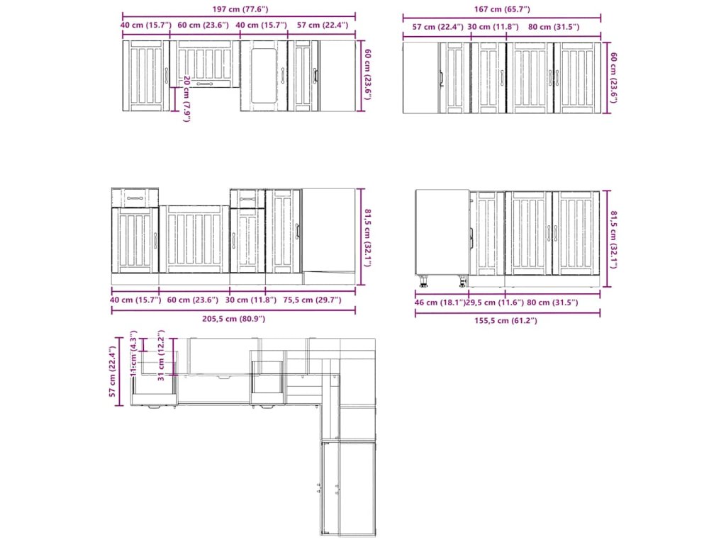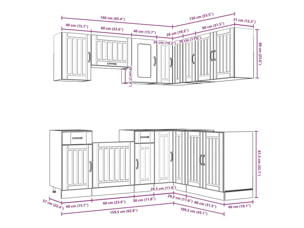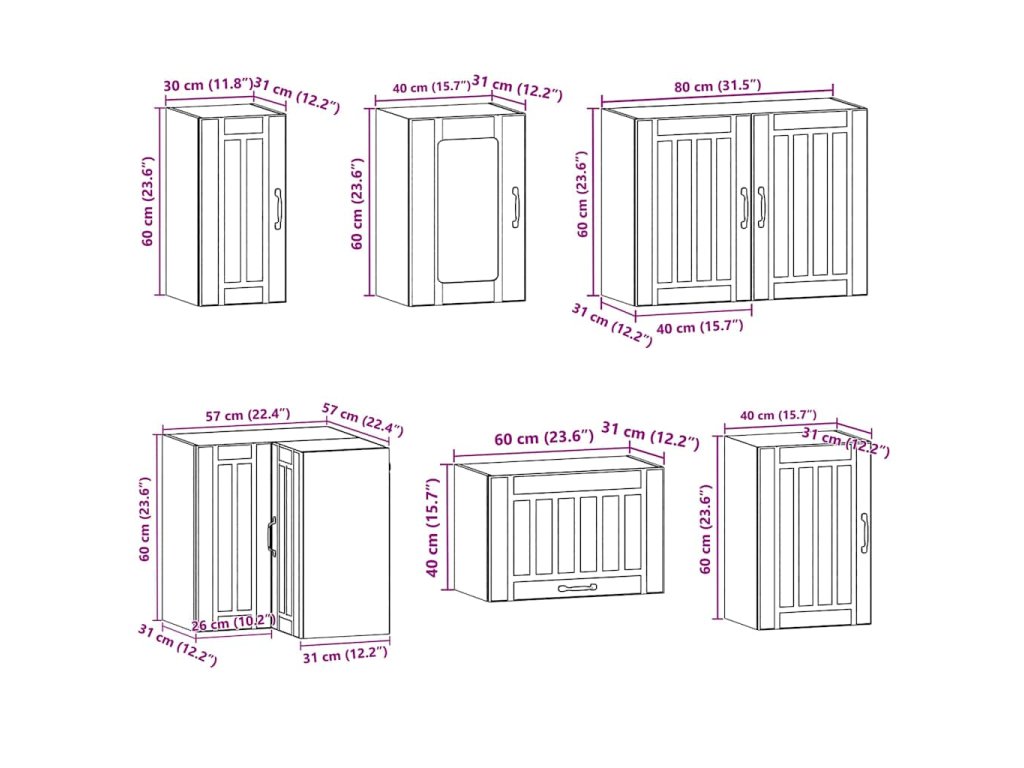 - Dostatok úložného priestoru: Súprava kuchynských skriniek má veľa priehradiek a ponúka dostatočný priestor na uloženie misiek, tanierov, hrncov a iných kuchynských spotrebičov.