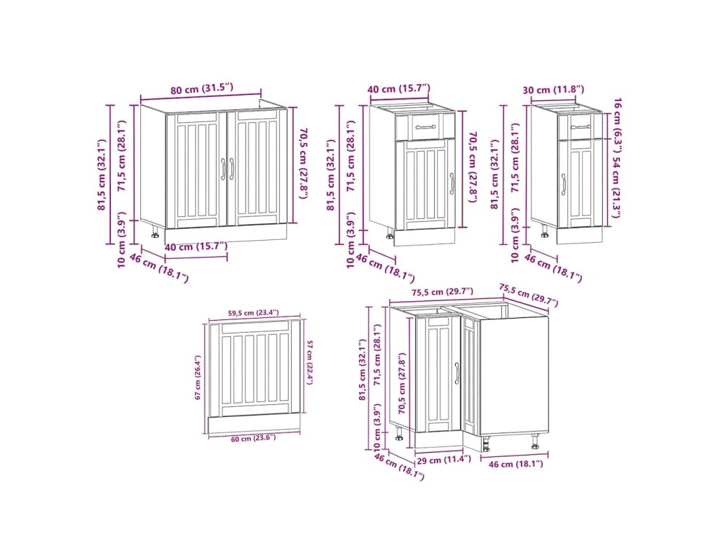 - 1 x Drezová spodná skrinka: 80 x 46 x 81,5 cm (Š x H x V)