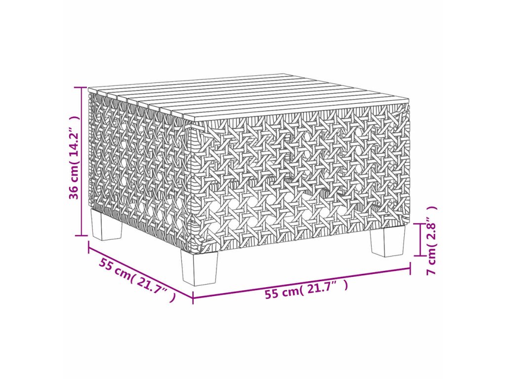 - Materiál: PE (polyetylén) ratan, oceľ s práškovou povrchovou úpravou, akáciový masív s prírodným olejovým náterom