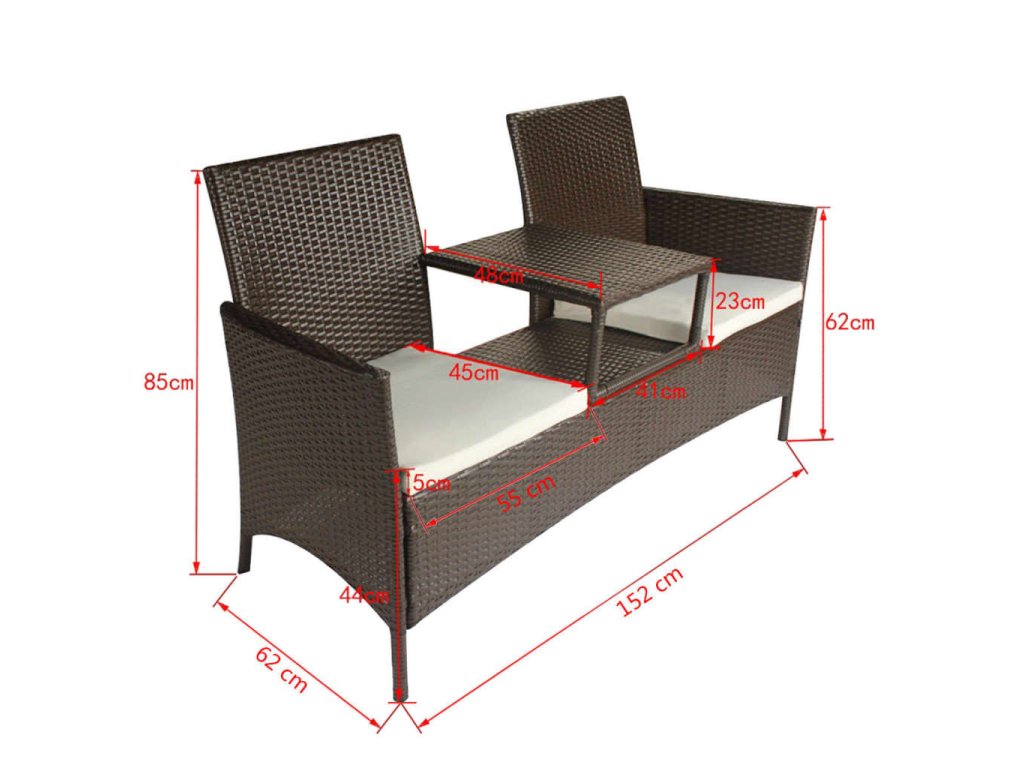 Súprava je vyrobená z PE ratanu, ktorý je vodovzdorný a odolný voči poveternostným vplyvom, takže sa dá ľahko očistiť, je trvácna a vhodná aj na každodenné používanie. Lavička má pevný oceľový rám s práškovou povrchovou úpravou. Je ľahká, a preto ju môžete bez problémov presunúť, kam potrebujete. Dve sedadlá sú spojené stolíkom, na ktorý si môžete odložiť nápoje či obľúbené knižky, aby ste ich mali vždy poruke.