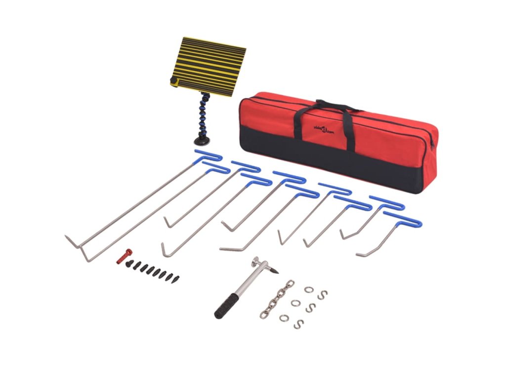 Sada náradia obsahuje 10 tyčí na opravu preliačín, 1 dosku s čiarovým rastrom a flexibilným držiakom, 1 priklepávací nástroj s 8 rôznymi hrotmi, 1 vratidlo na závitníky, 1 reťaz, 3 háky v tvare S a 3 krúžky. Sada sa dodáva v praktickej taške pre jednoduchú prepravu a skladovanie.