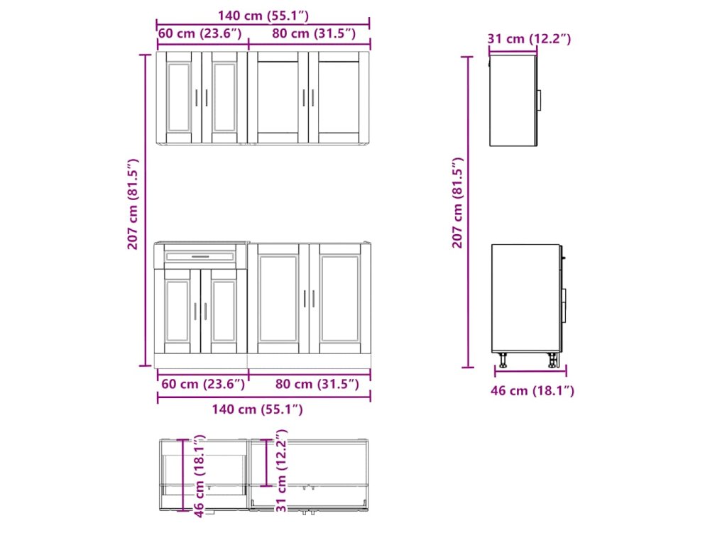 - Dostatok úložného priestoru: Súprava kuchynských skriniek má veľa priehradiek a ponúka dostatočný priestor na uloženie misiek, tanierov, hrncov a iných kuchynských spotrebičov.