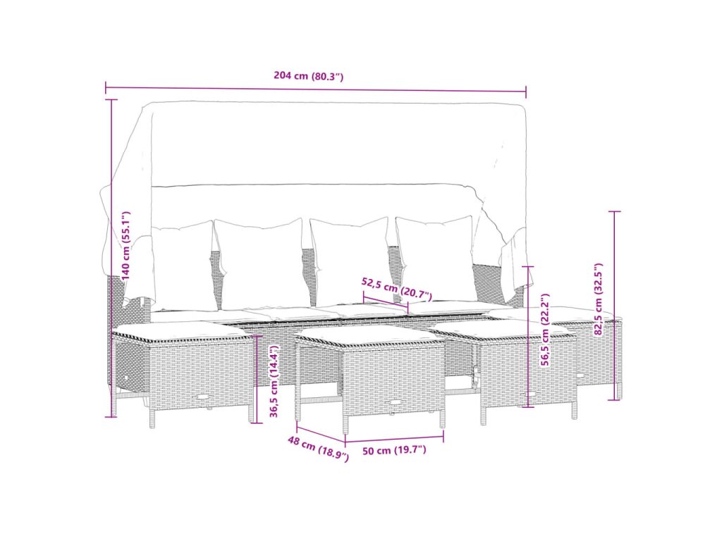 - Rozmery bez baldachýnu: 204 x 55 x 69,5 cm (Š x H x V)