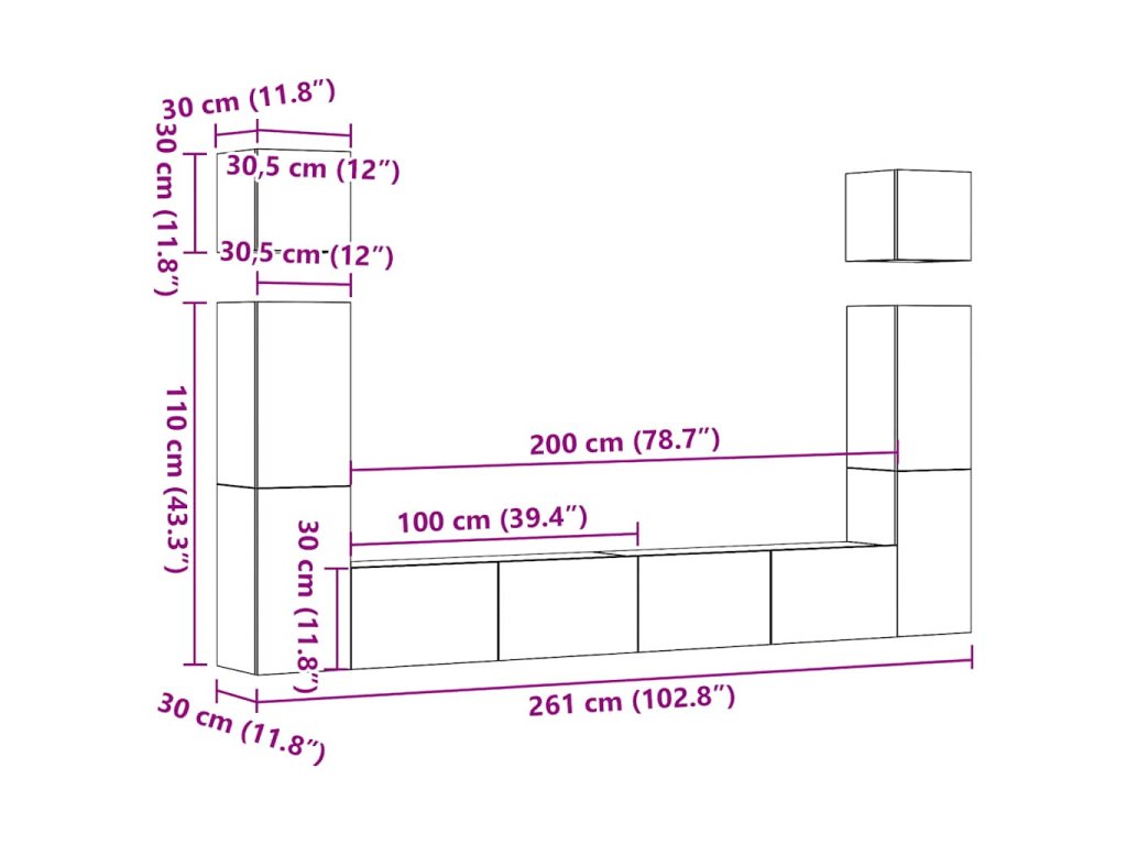 - 1 x TV skrinka: 30,5 x 30 x 110 cm (Š x H x V)