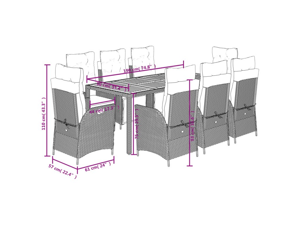 - Materiál: PE ratan, práškovaná oceľ, masívne akáciové drevo s olejovým náterom