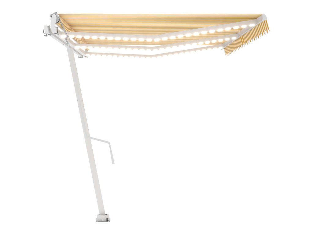 Táto vonkajšia markíza pozostáva z hliníkového rámu s práškovou povrchovou úpravou, ktorý je odolný voči hrdzi, vďaka čomu je ľahká a zároveň pevná. Látka voľne stojacej markízy je vyrobená z polyesteru s vysokou hustotou s vrstvou PU, a preto je vodovzdorná a odolná voči UV žiareniu. Sklon a výšku markízy si môžete podľa potreby nastaviť. Robustná základňa sa dá otáčať o 360 stupňov, aby ste si ju mohli vždy prispôsobiť podľa svojich predstáv. Automatická vysúvacia markíza sa dá jednoducho vysúvať a zaťahovať pomocou diaľkového ovládania, ktoré je súčasťou balenia. Terasová markíza sa dá bez problémov ovládať aj pomocou dlhej ručnej kľuky. Okrem toho je vybavená aj senzorom vetra, ktorý markízu automaticky zatiahne počas veterných dní. LED svetlá vám v noci poskytnú energeticky úsporné osvetlenie.