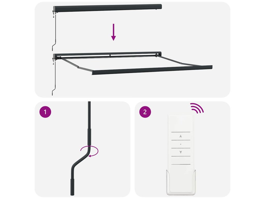 - Automatická funkcia: Markízu môžete jednoducho otvárať a sťahovať pomocou diaľkového ovládania, ktoré je súčasťou balenia.