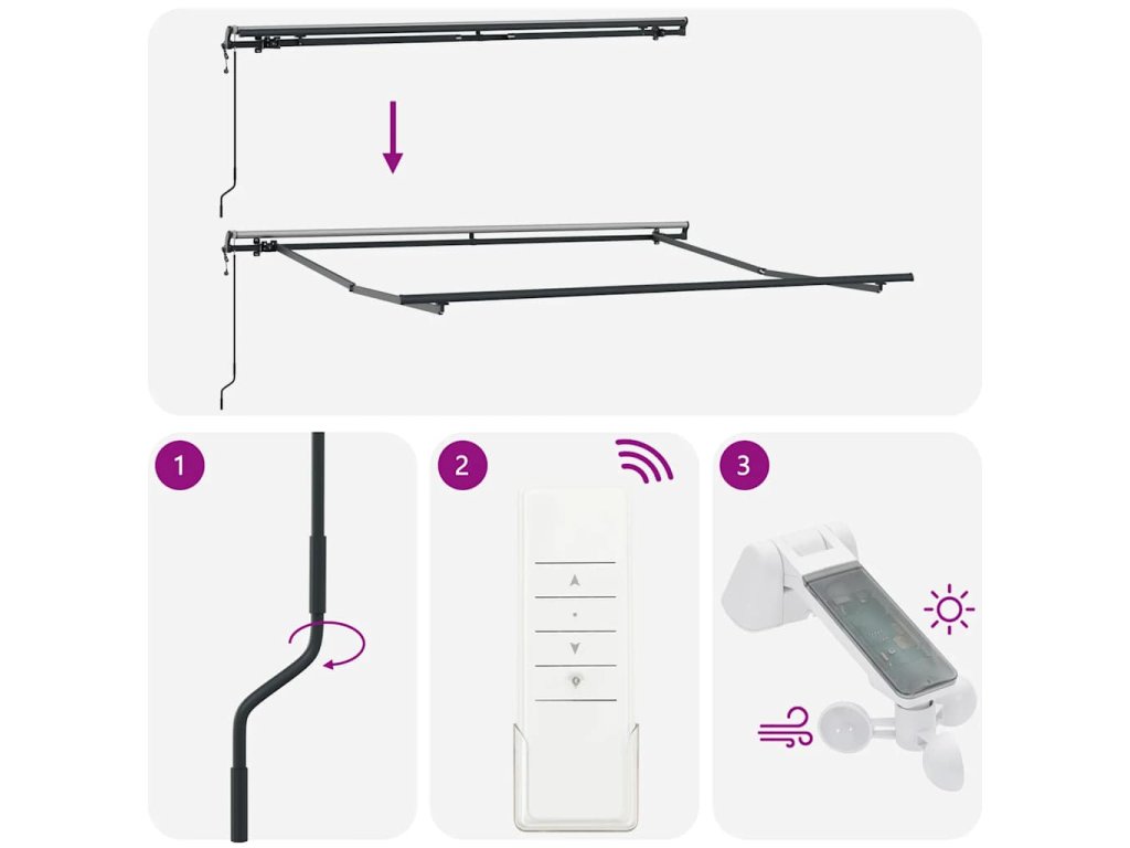 - Automatická funkcia: Markízu môžete jednoducho otvárať a sťahovať pomocou diaľkového ovládania, ktoré je súčasťou balenia.
