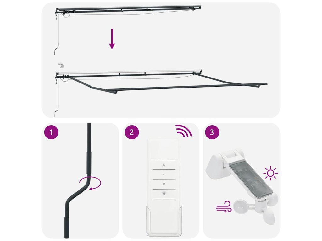 - Automatická funkcia: Markízu môžete jednoducho otvárať a sťahovať pomocou diaľkového ovládania, ktoré je súčasťou balenia.