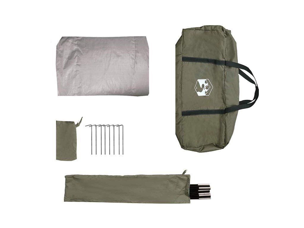 - Jednoducho sa stavia: Stan obsahuje robustné tyče a popruhy, pomocou ktorých ho jednoducho upevníte do zeme a pripevníte k autu, takže nebudete musieť hľadať kamene či iné ťažké predmety, aby ste ho spoľahlivo zaťažili.
