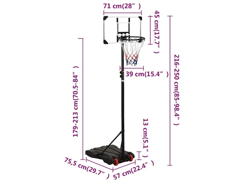 - Nastaviteľná výška: Stojan na basketbalový kôš má nastaviteľnú výšku a dá sa natiahnuť tak, aby vyhovoval rôznym hráčom. Tento basketbalový stojan je možné nastaviť na výšku od 216 cm do 250 cm.