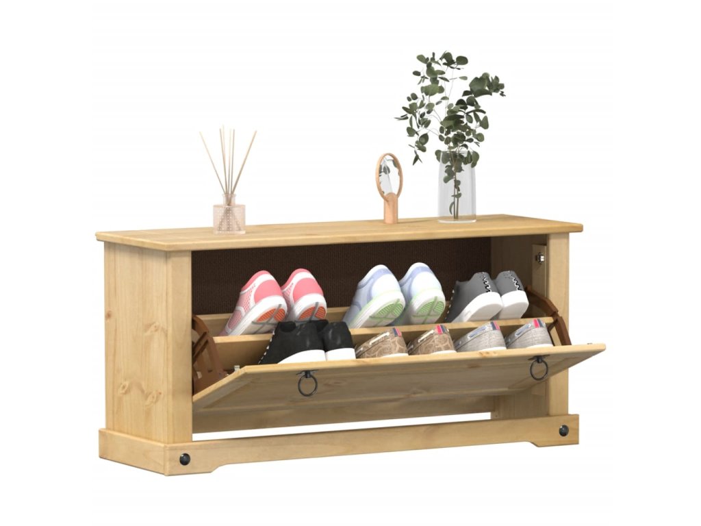 - Borovicový masív: Borovicový masív je krásny prírodný materiál. Borovicové drevo má rovnú kresbu a nachádzajú sa na ňom hrče, ktoré tomuto materiálu dodávajú charakteristický rustikálny vzhľad. Úložný priestor na topánky je vyrobený z masívneho borovicového dreva a je odolný a pevný.