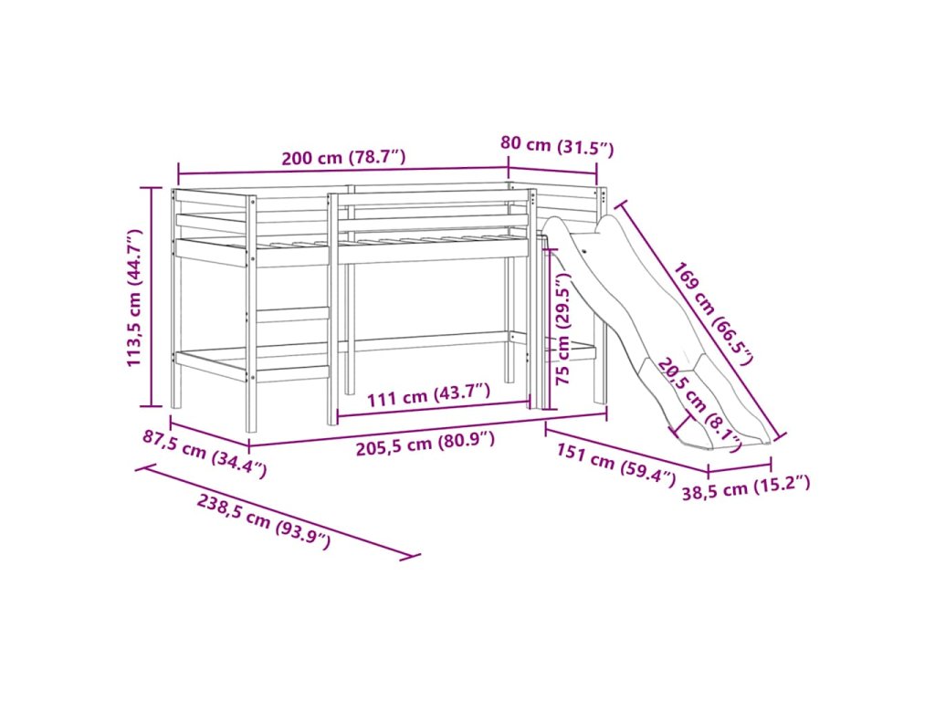 Táto detská poschodová posteľ je vyrobená z masívneho borovicového dreva a je určená na zábavu a optimalizáciu priestoru.