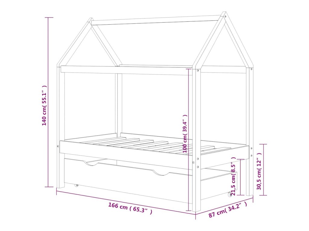 Posteľ je elegantne navrhnutá s rámom v štýle domčeka na strome, do ktorého môžete zavesiť závesy a vytvoriť tak súkromie pre svoje dieťa. Dá sa tiež použiť ako domček na na čítanie kníh alebo hranie pre vaše dieťa. Rám postele je vyrobený z masívneho borovicového dreva a je mimoriadne pevný a odolný. Silné lamely ponúkajú potrebnú oporu a sú veľmi pohodlné. Priložená zásuvka postele s 2 držadlami poskytuje dostatok úložného priestoru na uloženie zloženého oblečenia, hračiek atď., vďaka čomu bude vaša izba čistá a uprataná. Ľahko pohyblivé kolesá fungujú na podlahách s kobercom aj na drevenej podlahe. Tento rám postele je vhodný pre matrac s rozmermi 80 x 160 cm.