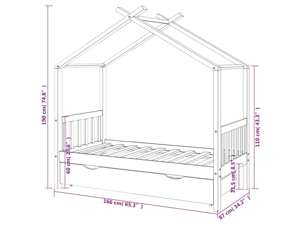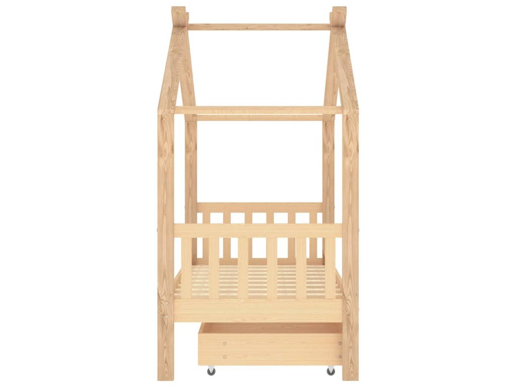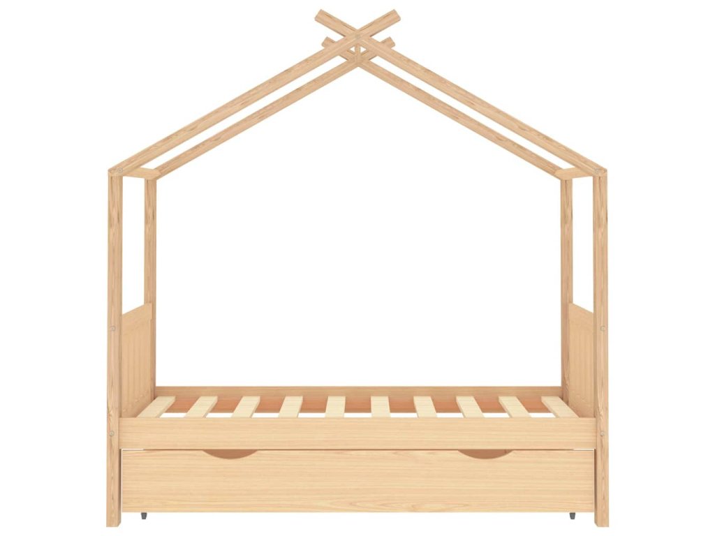Posteľ je elegantne navrhnutá s rámom v štýle domčeka na strome, do ktorého môžete zavesiť závesy a vytvoriť tak súkromie pre svoje dieťa. Dá sa tiež použiť ako domček na na čítanie kníh alebo hranie pre vaše dieťa. Rám postele je vyrobený z masívneho borovicového dreva a je mimoriadne pevný a odolný. Silné lamely ponúkajú potrebnú oporu a sú veľmi pohodlné. Priložená zásuvka postele s 2 držadlami poskytuje dostatok úložného priestoru na uloženie zloženého oblečenia, hračiek atď., vďaka čomu bude vaša izba čistá a uprataná. Ľahko pohyblivé kolesá fungujú na podlahách s kobercom aj na drevenej podlahe. Tento rám postele je vhodný pre matrac s rozmermi 80 x 160 cm.